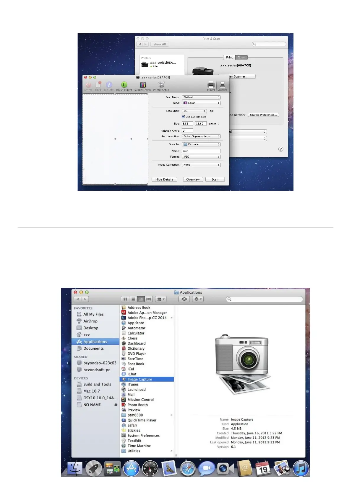 command+shift+C to open the window. Find "Image Capture" in "Applications" (or conduct keyboard shortcuts