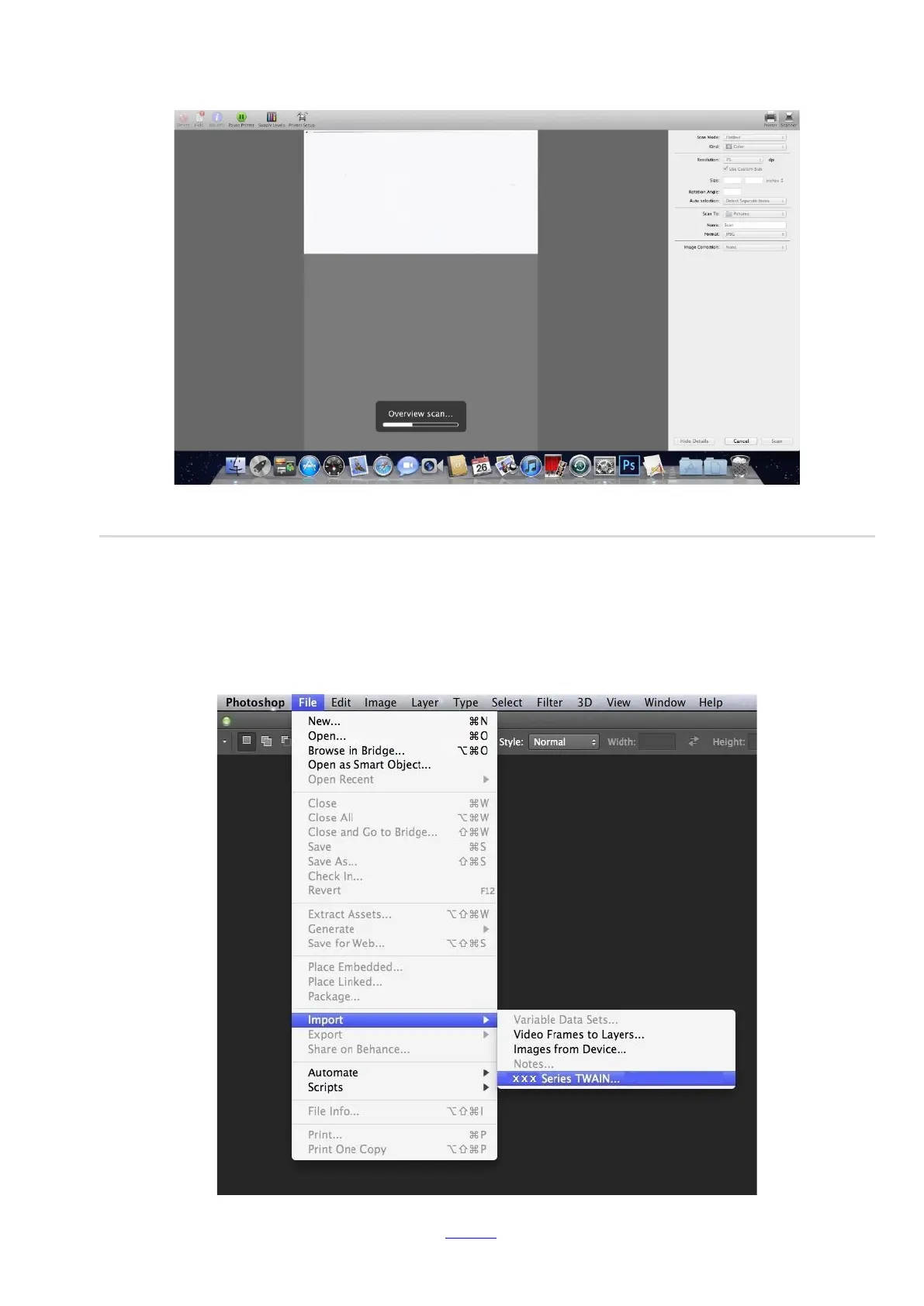 1) Launch Photoshop, click on "File" – "Import" on the top left corner and select TWAIN Scan, as is shown below: