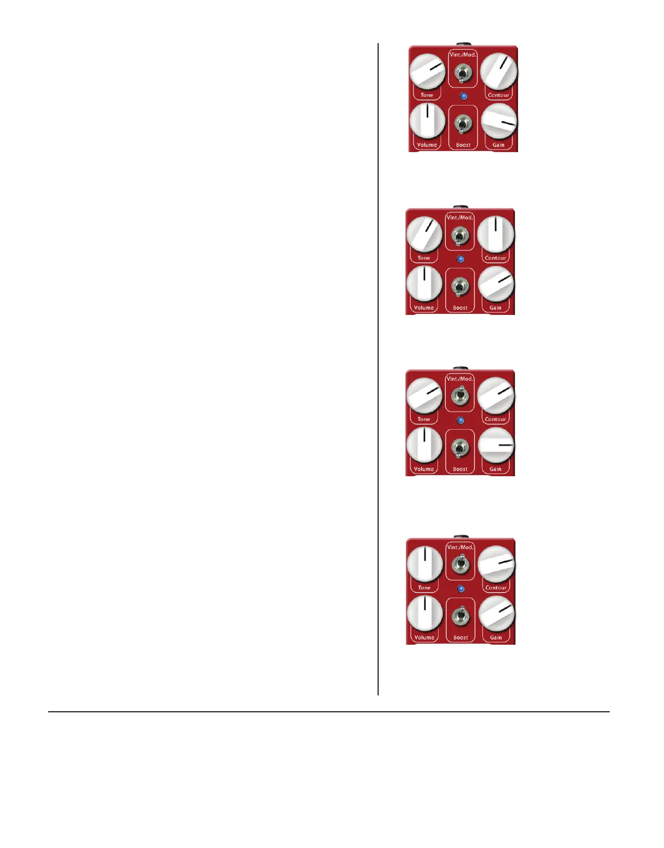 Boost toggle/footswitch OFF, Vint./Modern on VINT, Gain at