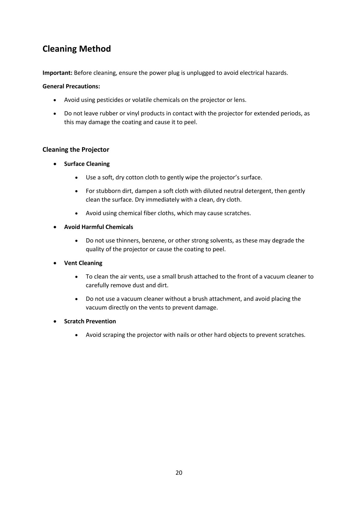 • Avoid scraping the projector with nails or other hard objects to prevent scratches.