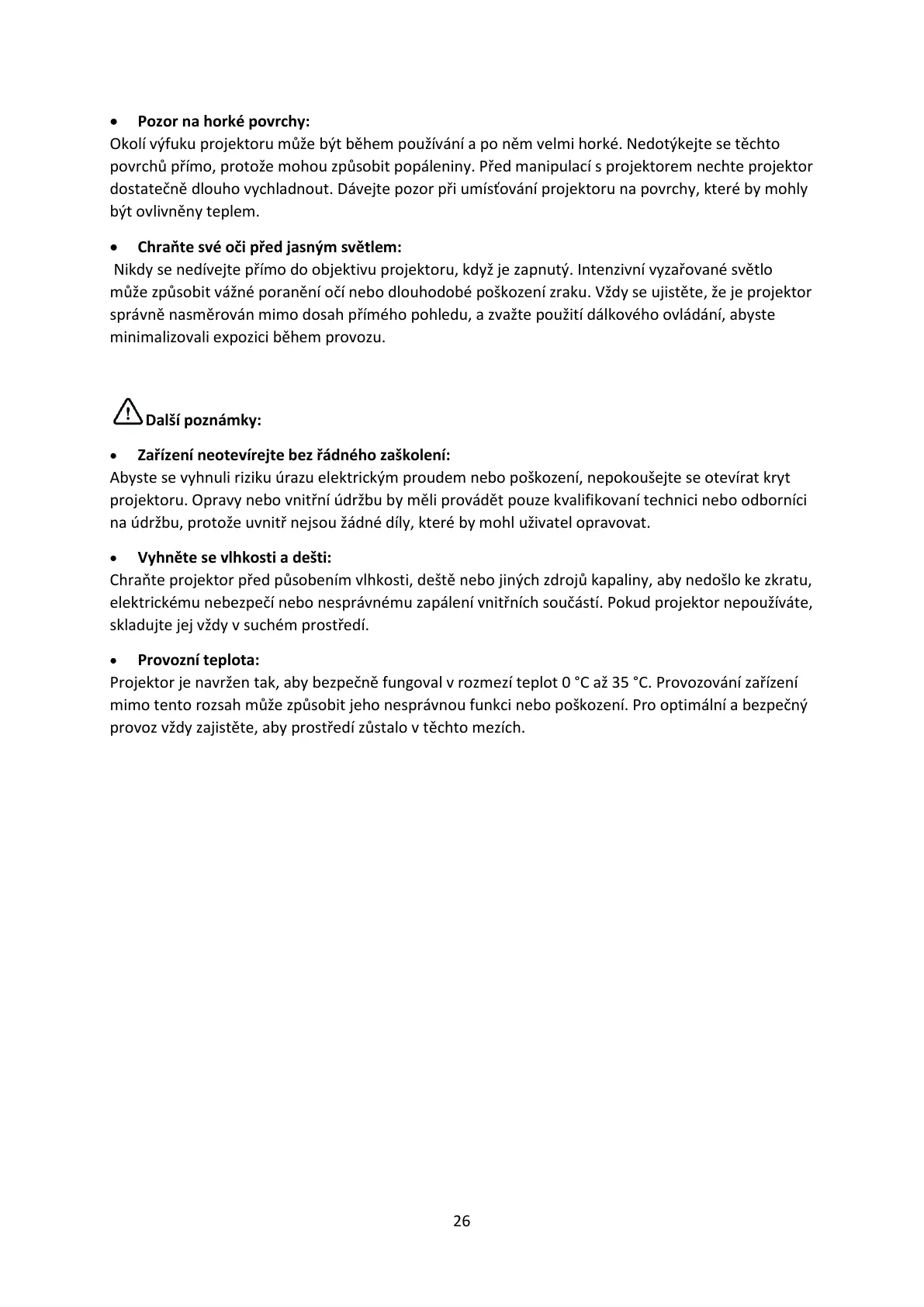 Projektor je navržen tak, aby bezpečně fungoval v rozmezí teplot 0 °C až 35 °C. Provozování zařízení