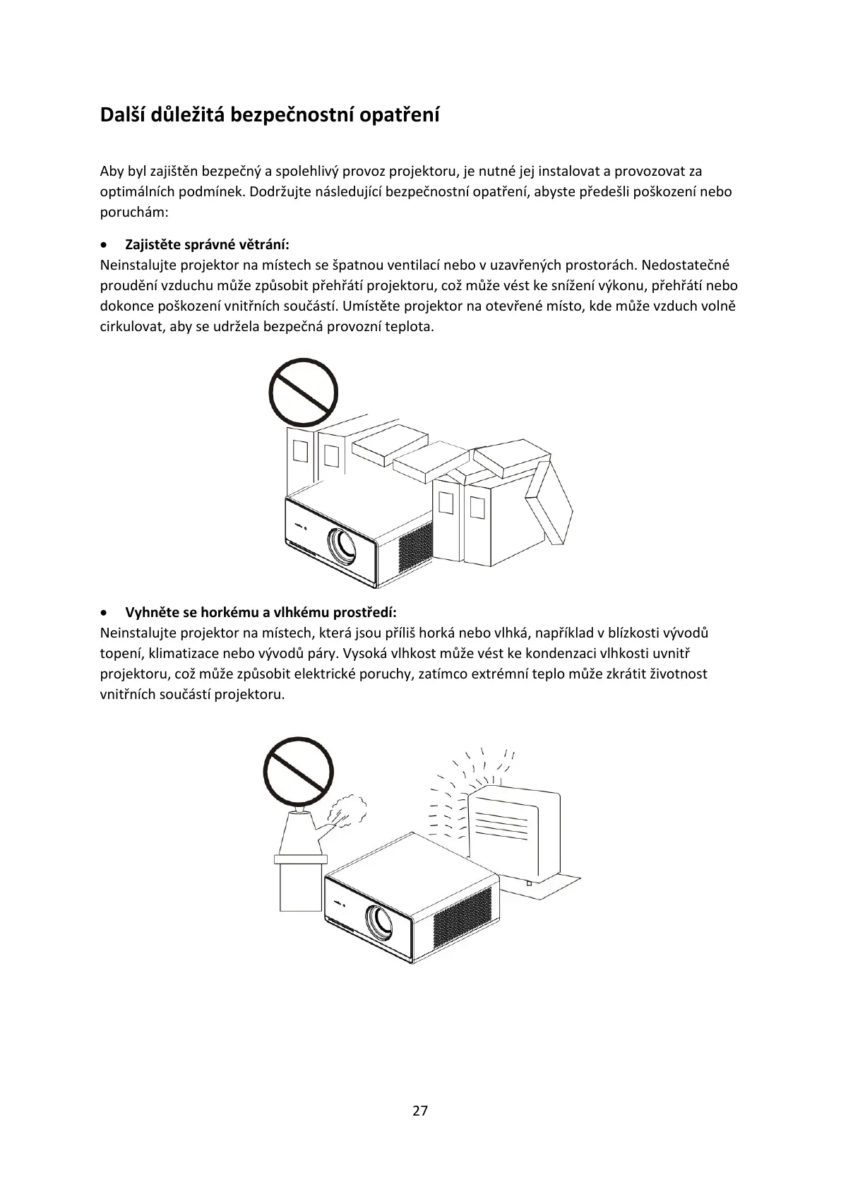 Aby byl zajištěn bezpečný a spolehlivý provoz projektoru, je nutné jej instalovat a provozovat za