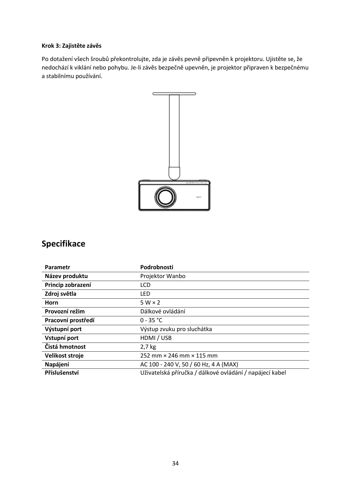 nedochází k viklání nebo pohybu. Je-li věs bezpečně upevněn, je projektor ipraven k bezpečnému