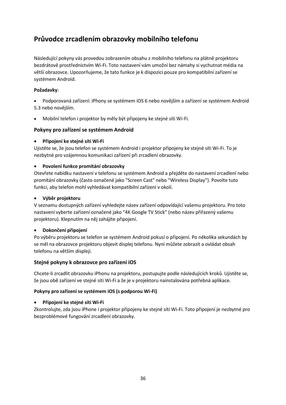 • Mobilní telefon i projektor by měly být připojeny ke stejné síti Wi-Fi.