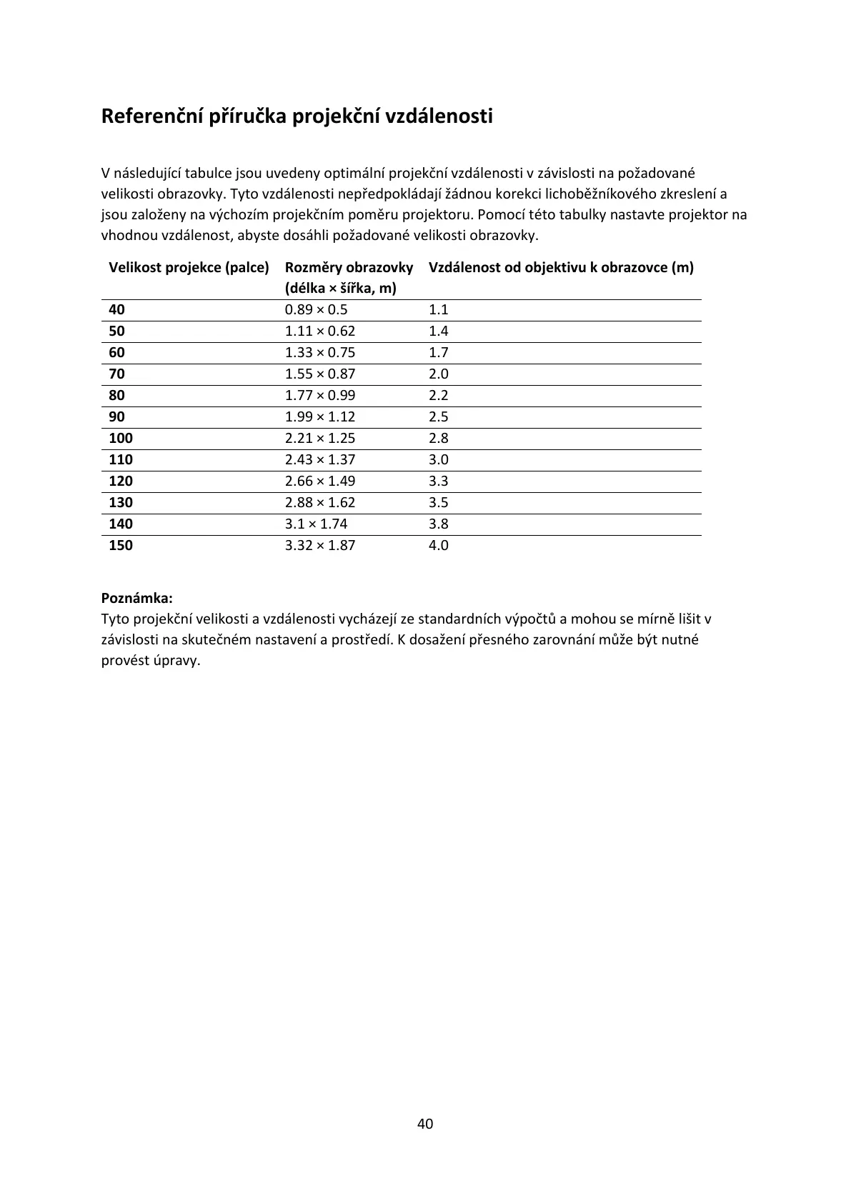 jsou založeny na výchozím projekčním poměru projektoru. Pomocí této tabulky nastavte projektor na