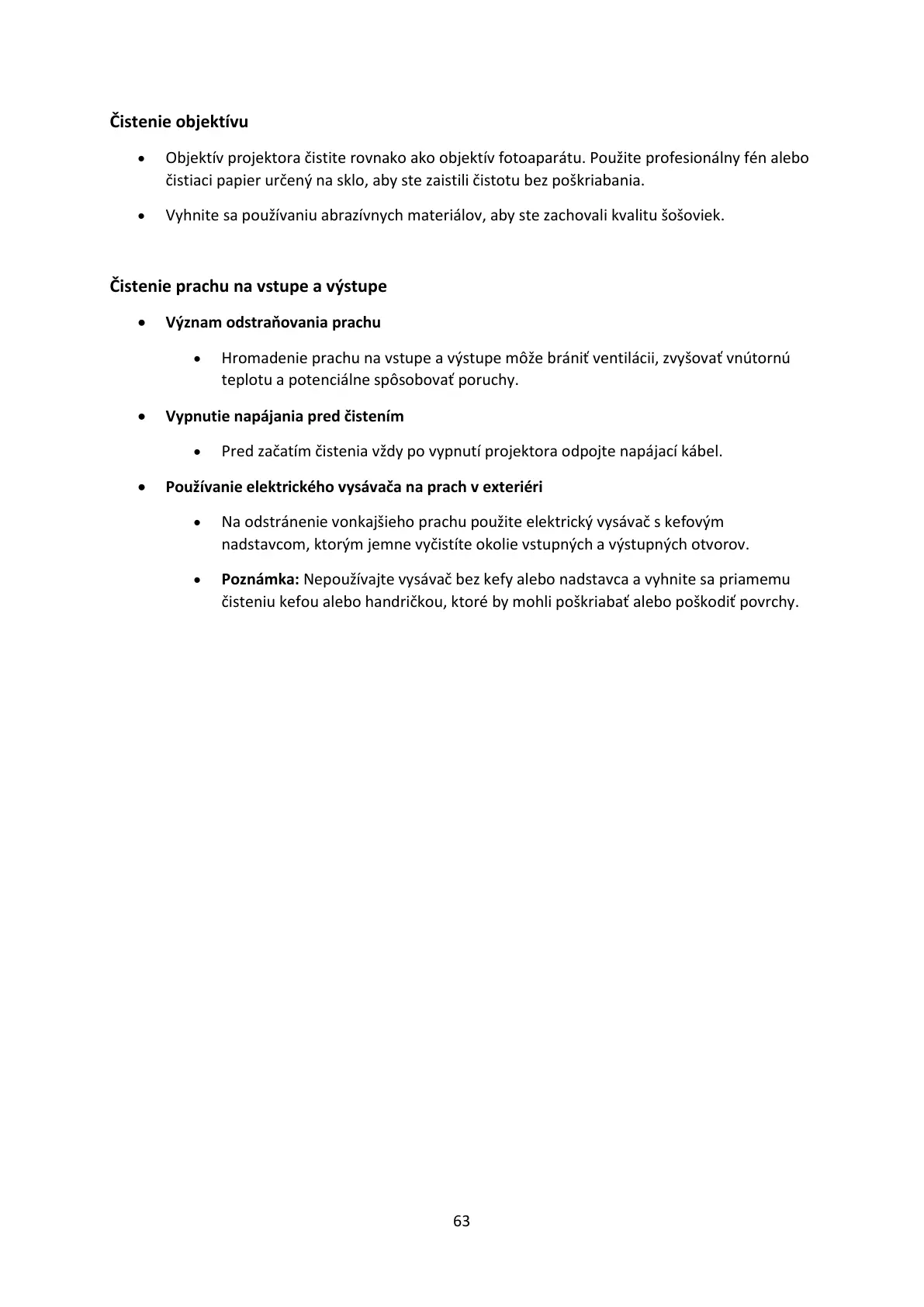 • Objektív projektora čistite rovnako ako objektív fotoaparátu. Použite profesionálny fén alebo