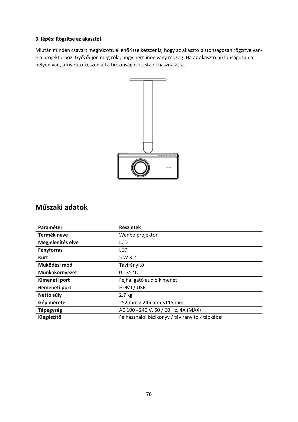 e a projektorhoz. Győződjön meg róla, hogy nem inog vagy mozog. Ha az akasztó biztonságosan a