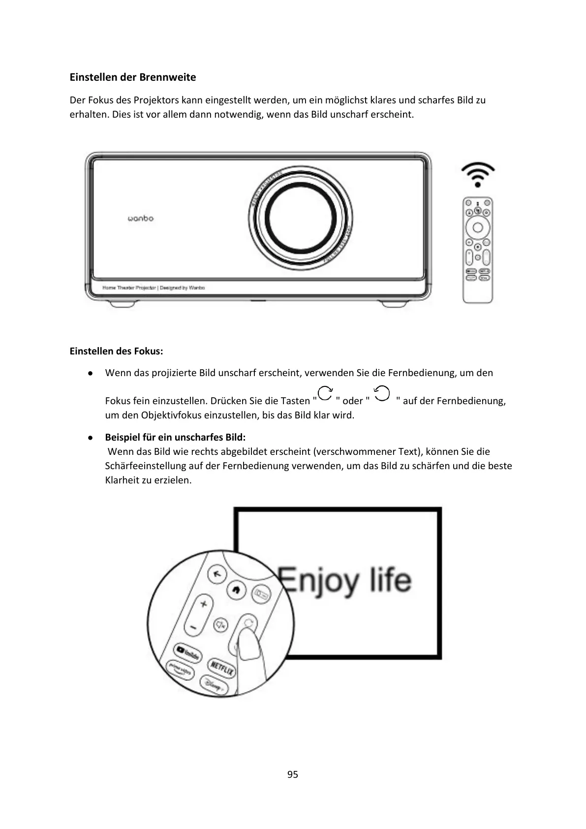 ● Wenn das projizierte Bild unscharf erscheint, verwenden Sie die Fernbedienung, um den