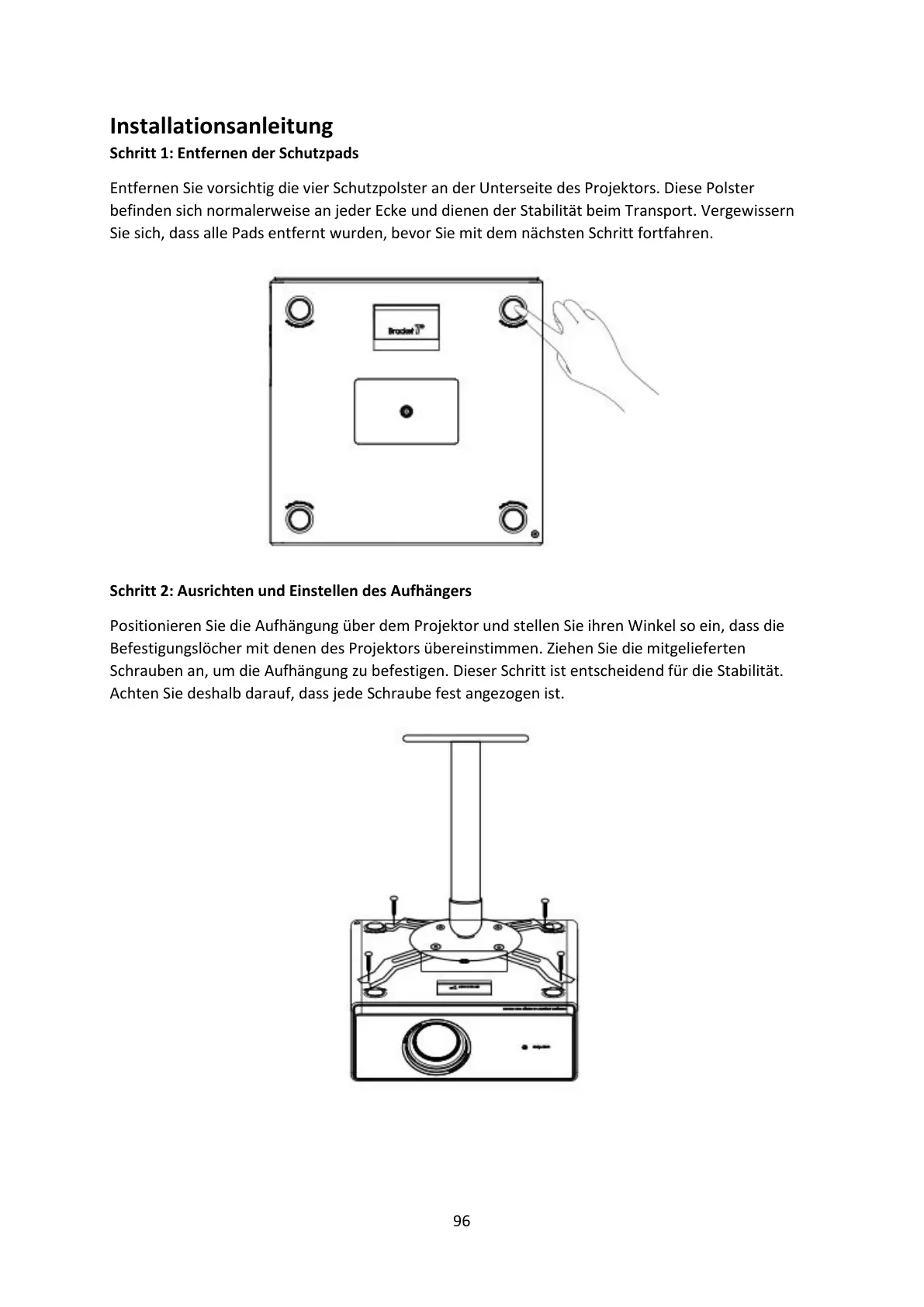 Positionieren Sie die Aufhängung über dem Projektor und stellen Sie ihren Winkel so ein, dass die