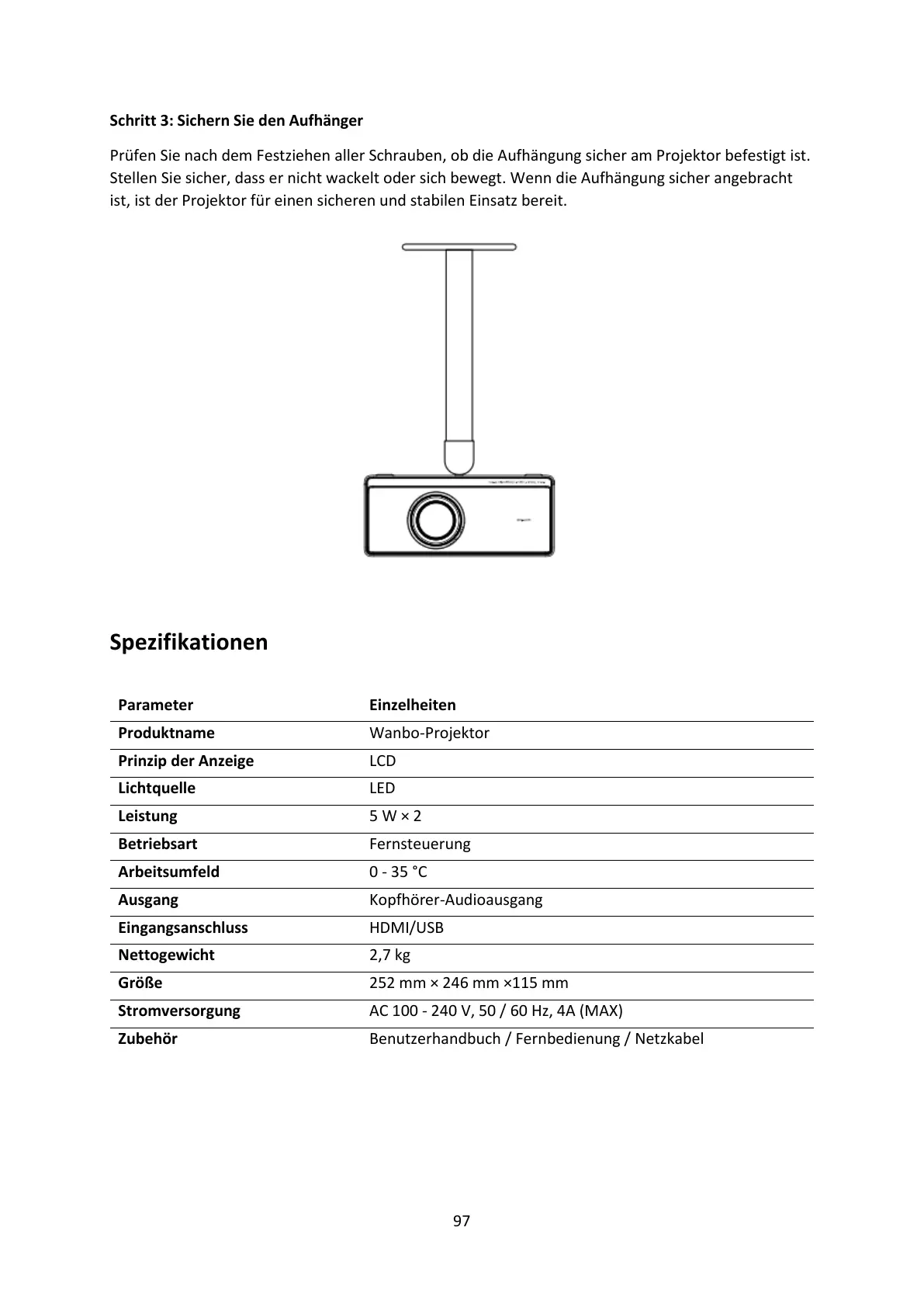 ist, ist der Projektor für einen sicheren und stabilen Einsatz bereit.