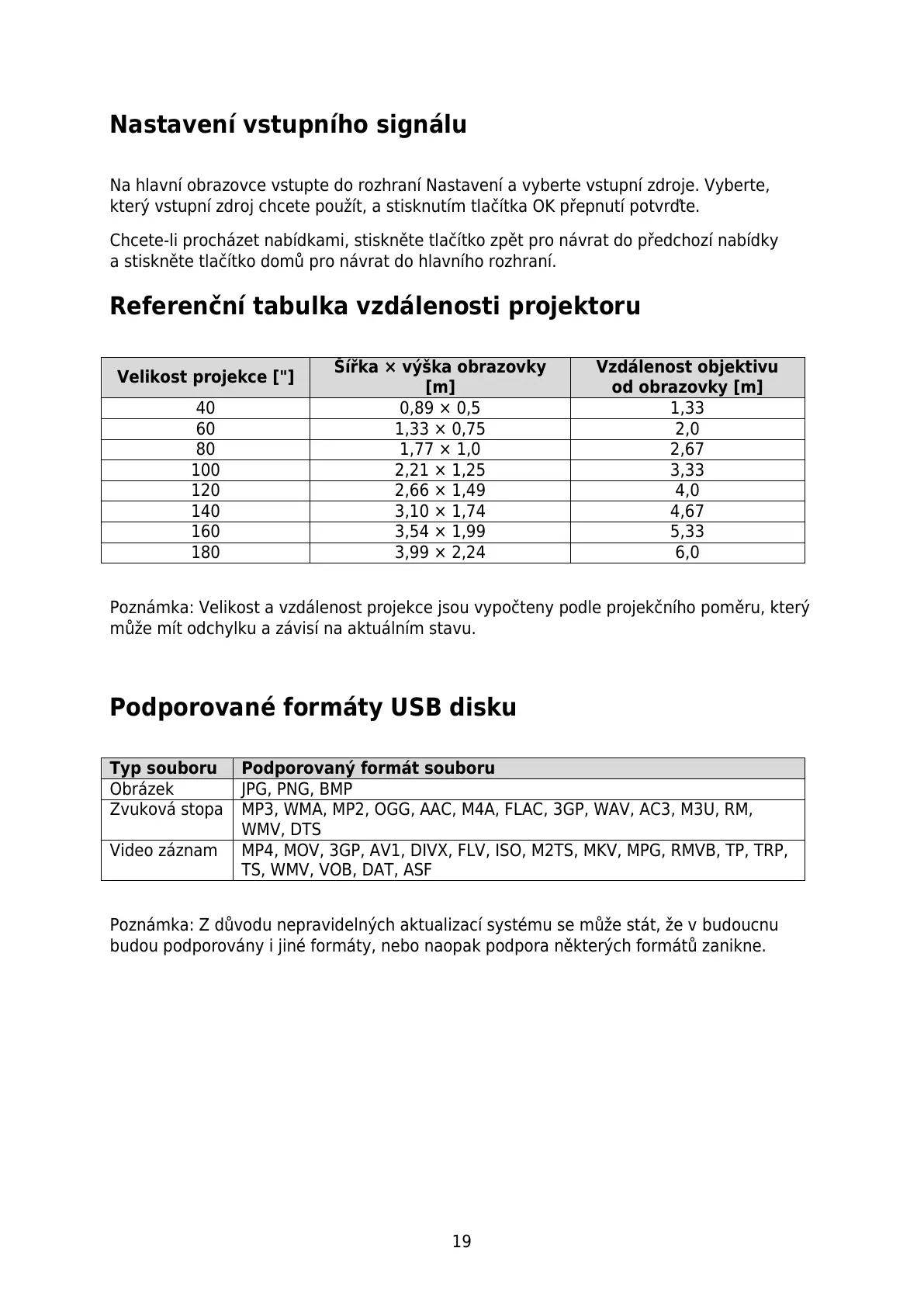 Poznámka: Velikost a vzdálenost projekce jsou vypočteny podle projekčního poměru, který