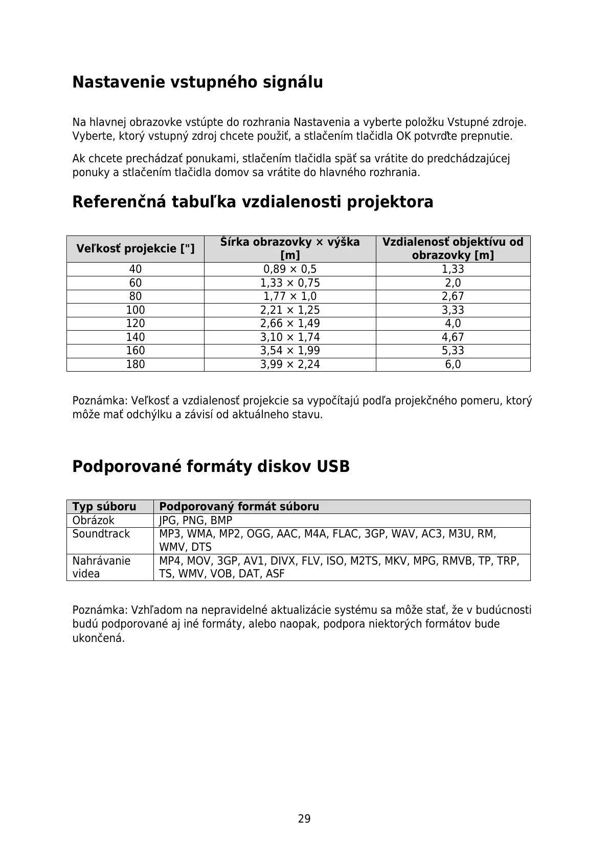 Poznámka: Veľkosť a vzdialenosť projekcie sa vypočítajú podľa projekčného pomeru, ktorý