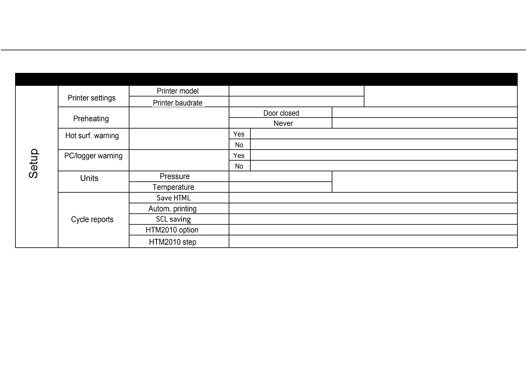 Table 2: Detail of the SETUP options (continued)