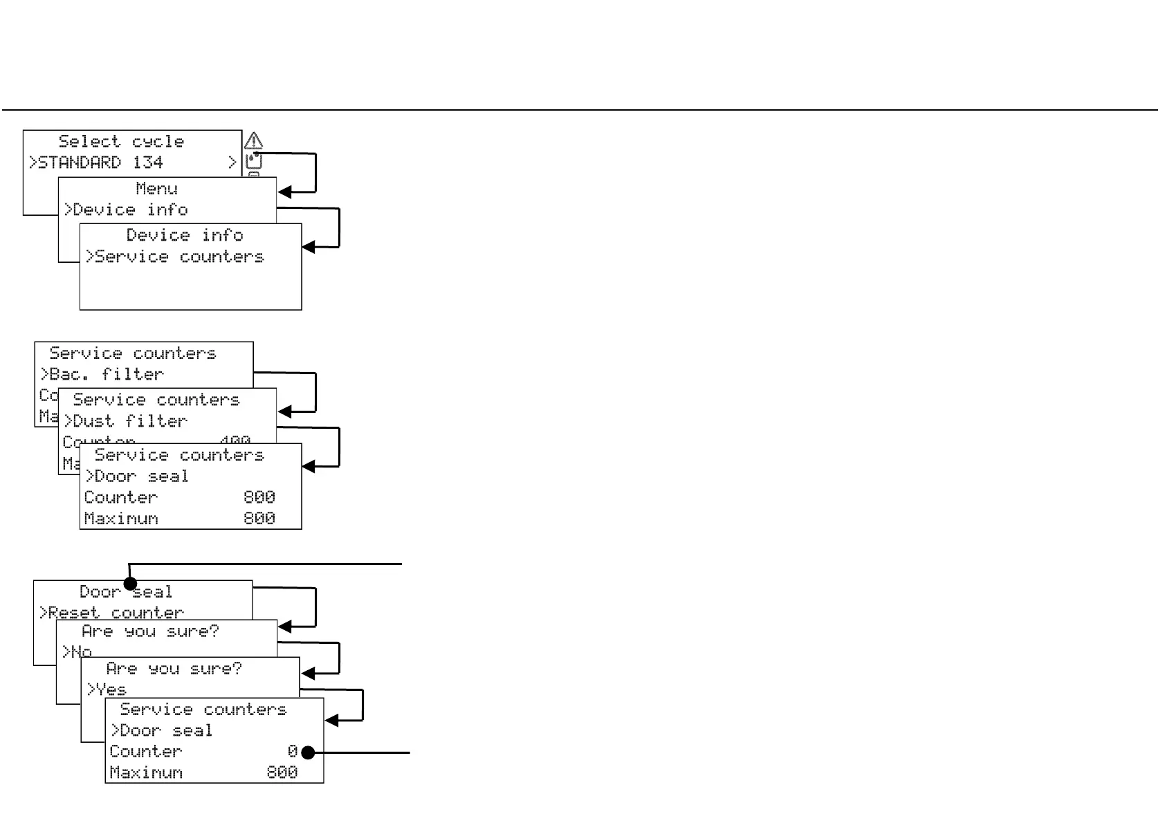 sequence: MENU – DEVICE INFO – SERVICE COUNTERS
