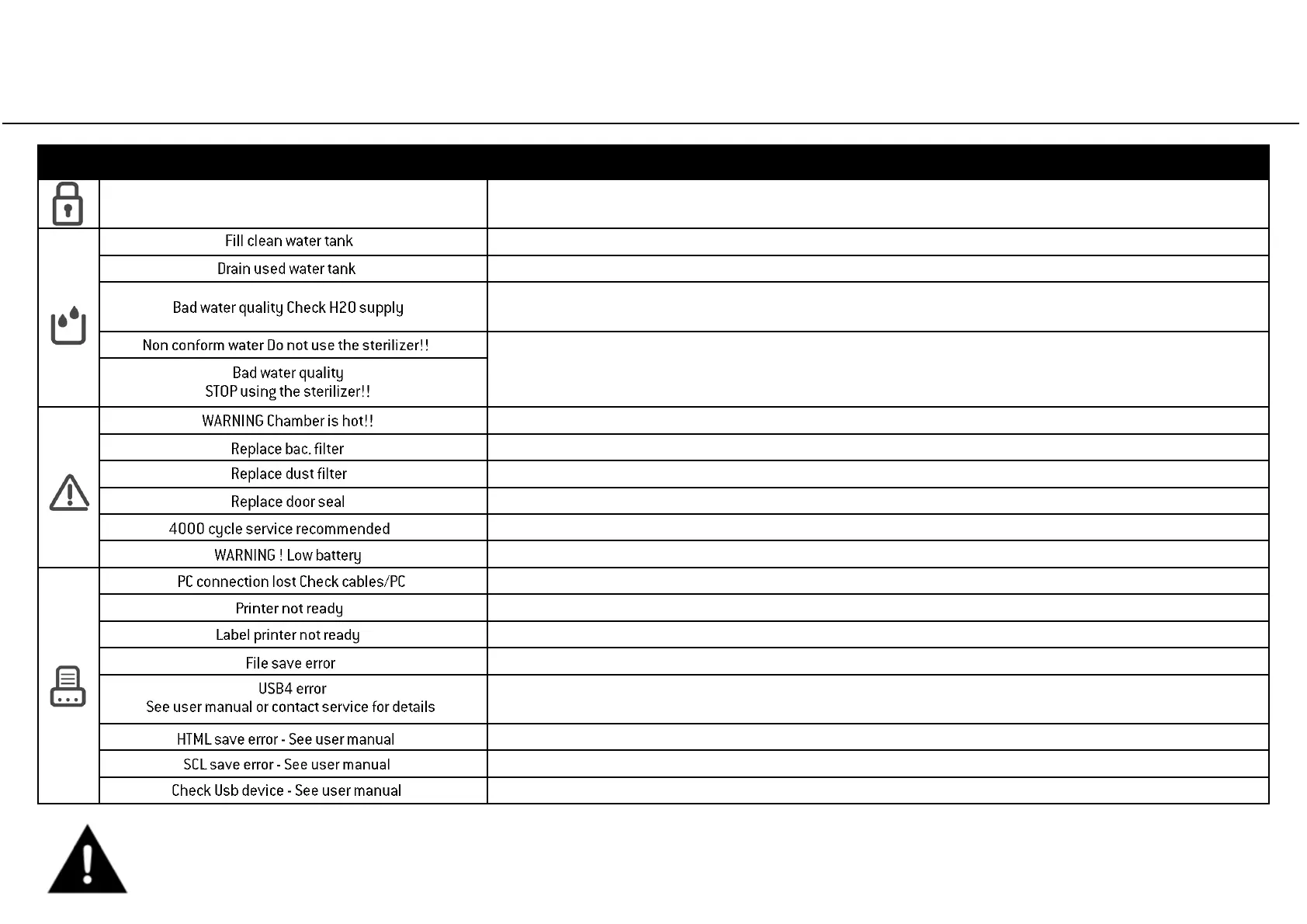 Check the external sterilizer water supply. You might have to replace filter cartridges – drain clean water tank and