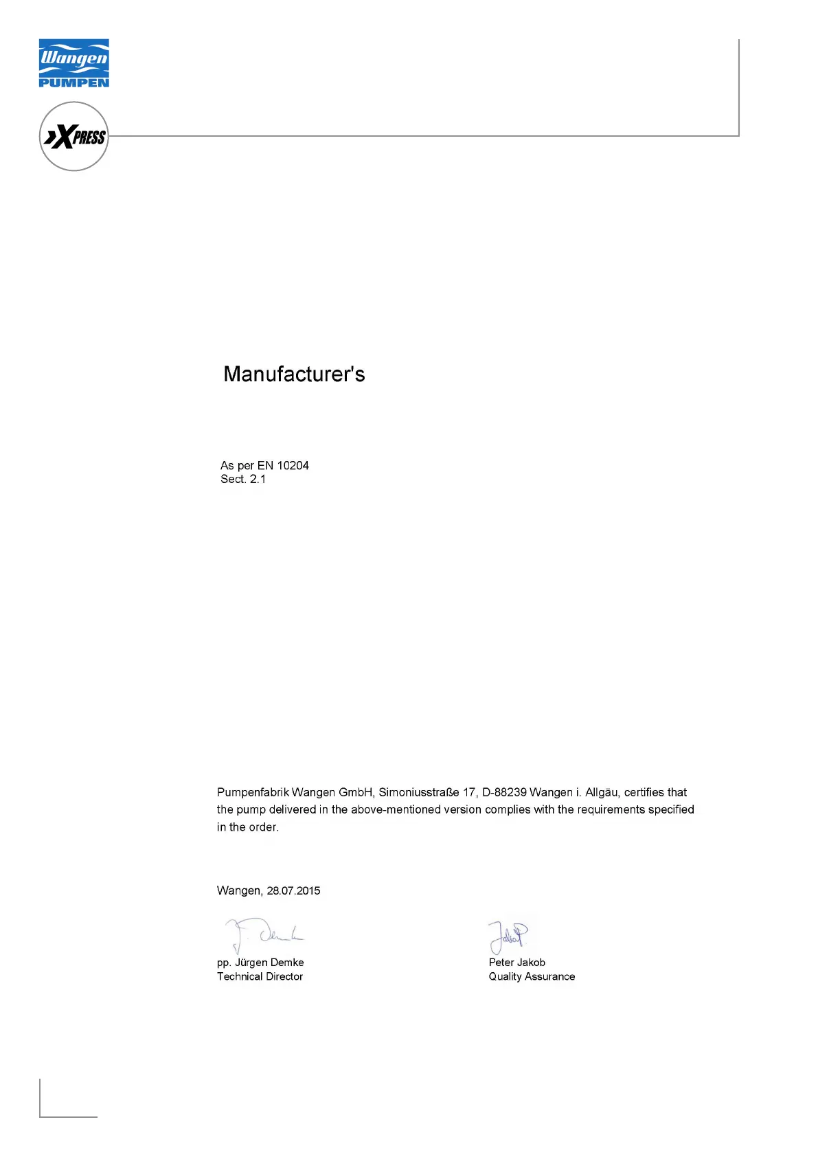 Wangen XPRESS 48 - Attestato DI Conformità Secondo EN10204