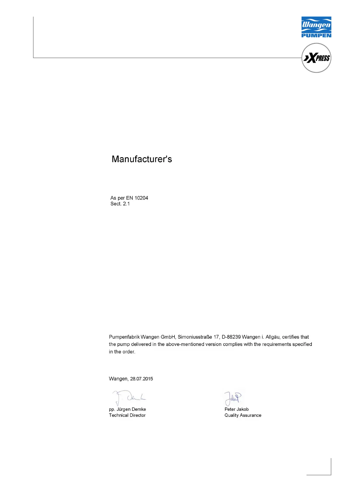 Wangen XPRESS 48 - Certificado de Fárica Conforme a EN10204 - Apdo.2.1