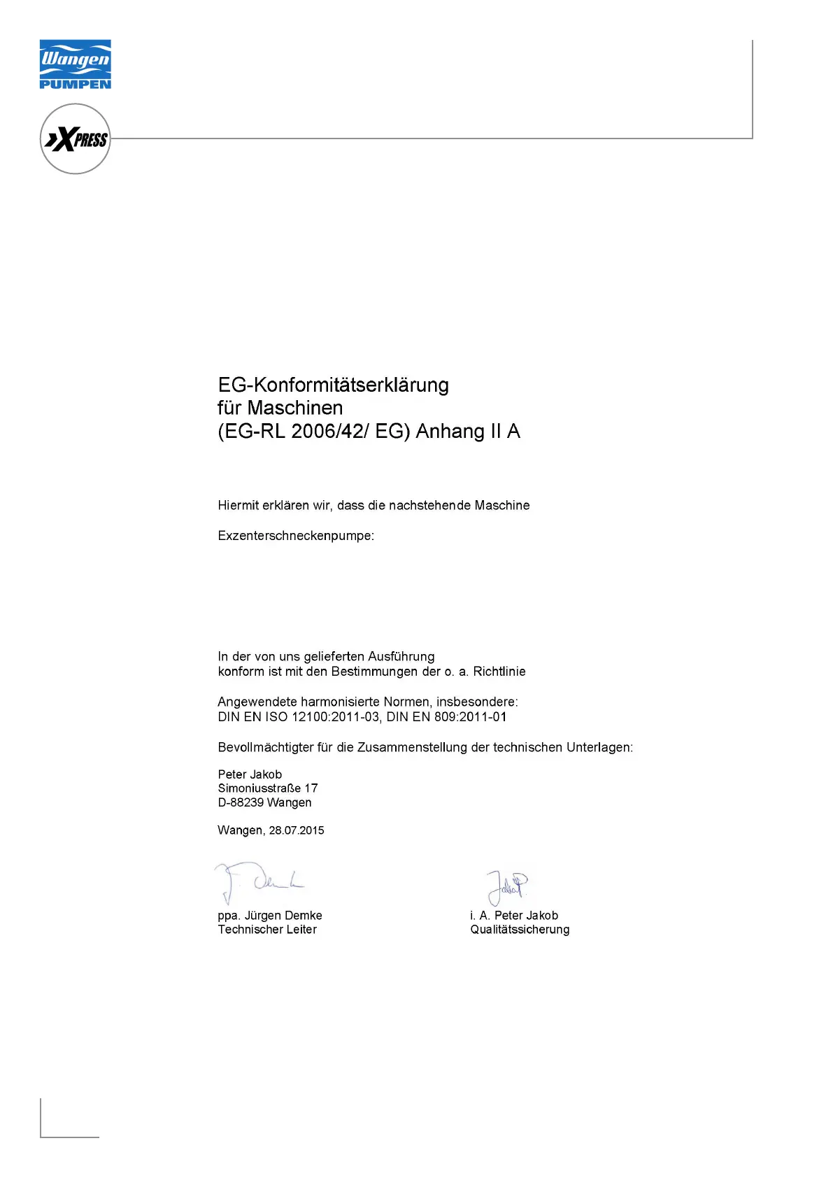 Wangen XPRESS 64 - Konformitaetserklaerung