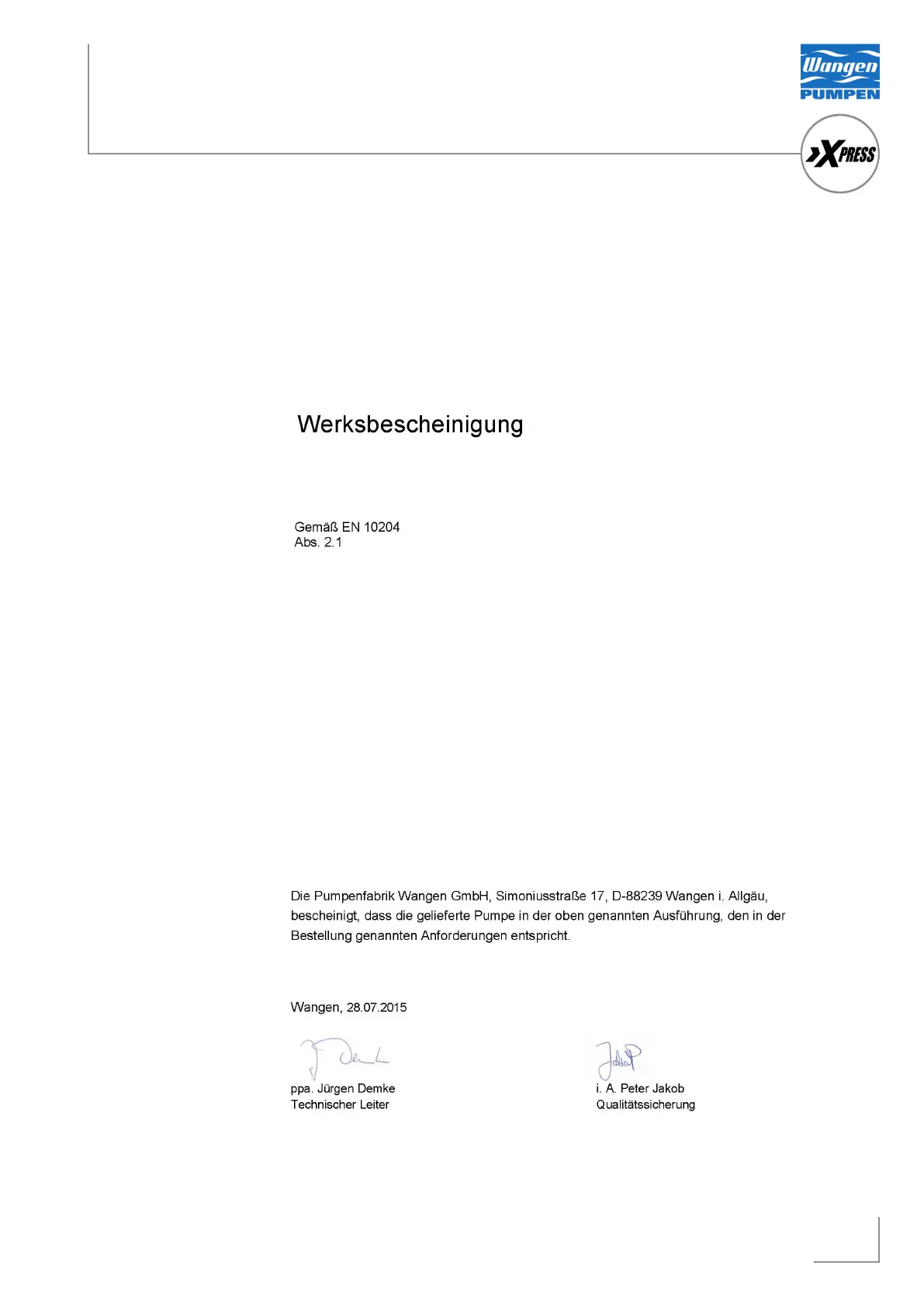 Wangen XPRESS 64 - Werksbescheinigung nach EN10204 - Abs