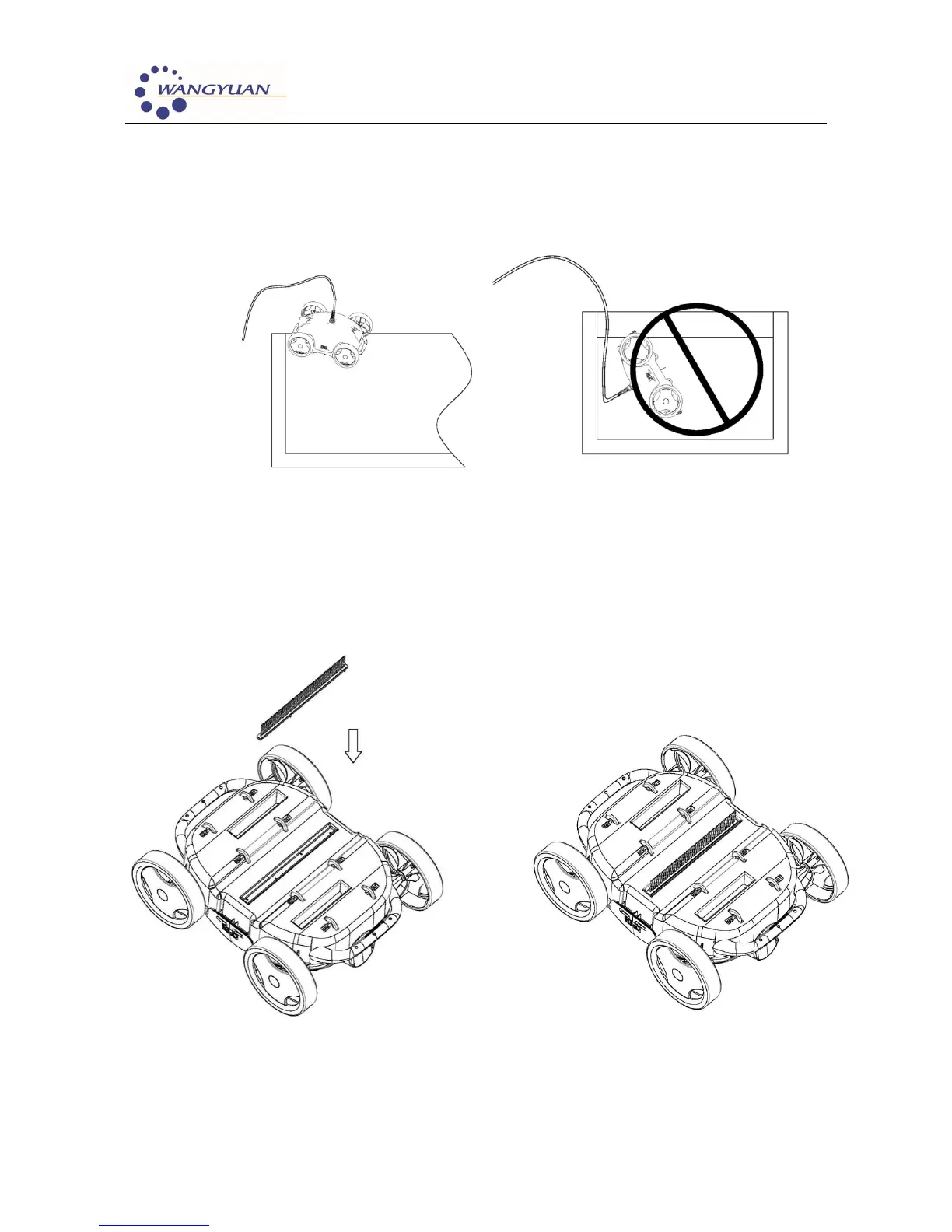 1. Putting into or lifting out from pool with the cleaner bottom toward the wall to avoid any