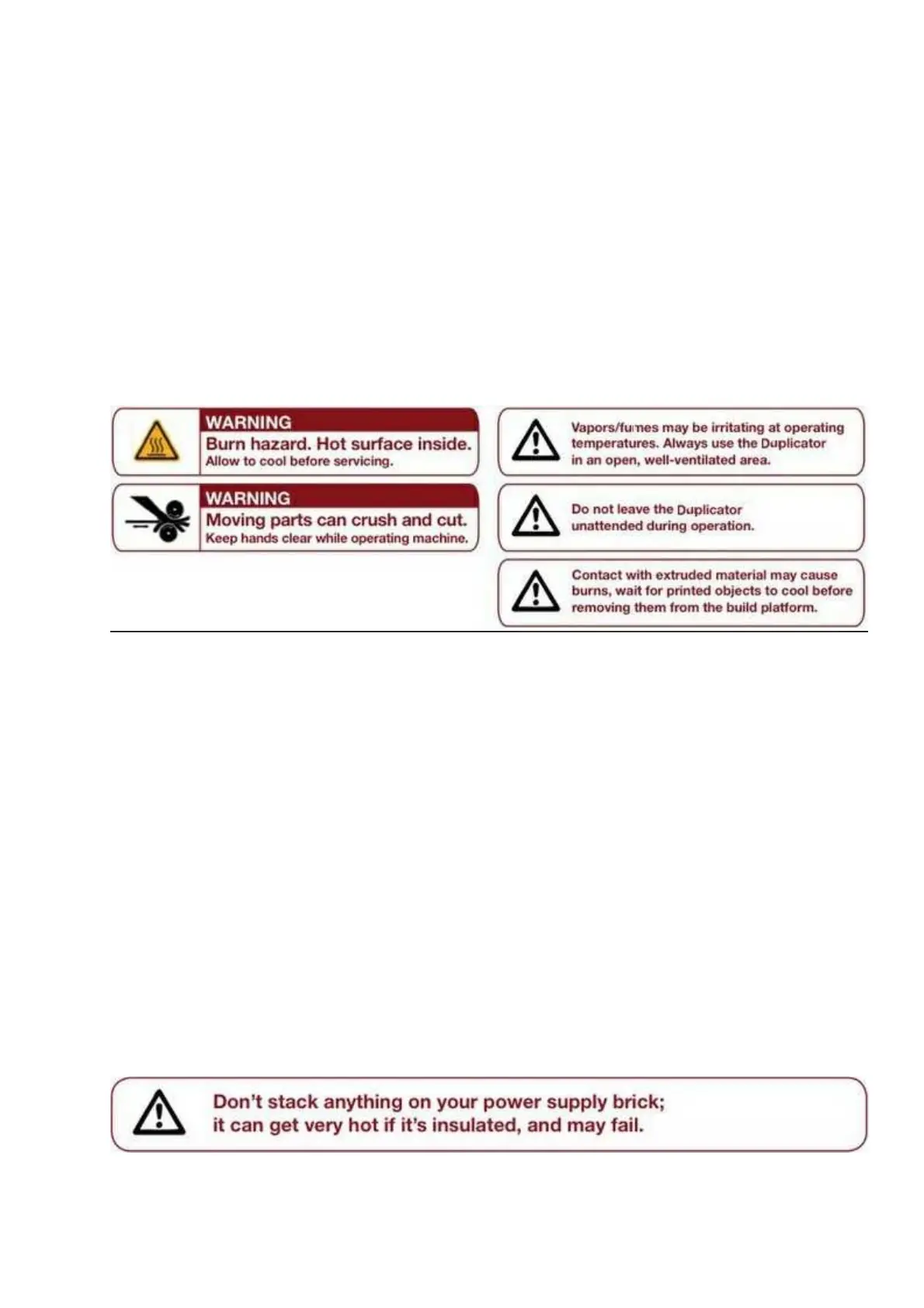 Caution: The Duplicator 3 generates high temperatures and includes moving parts that can cause injury. Never reach