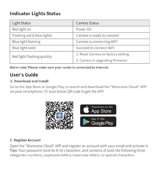 Wansview B4 - Indicator Lights Status; Download and Install Wansview Cloud App; Register Account