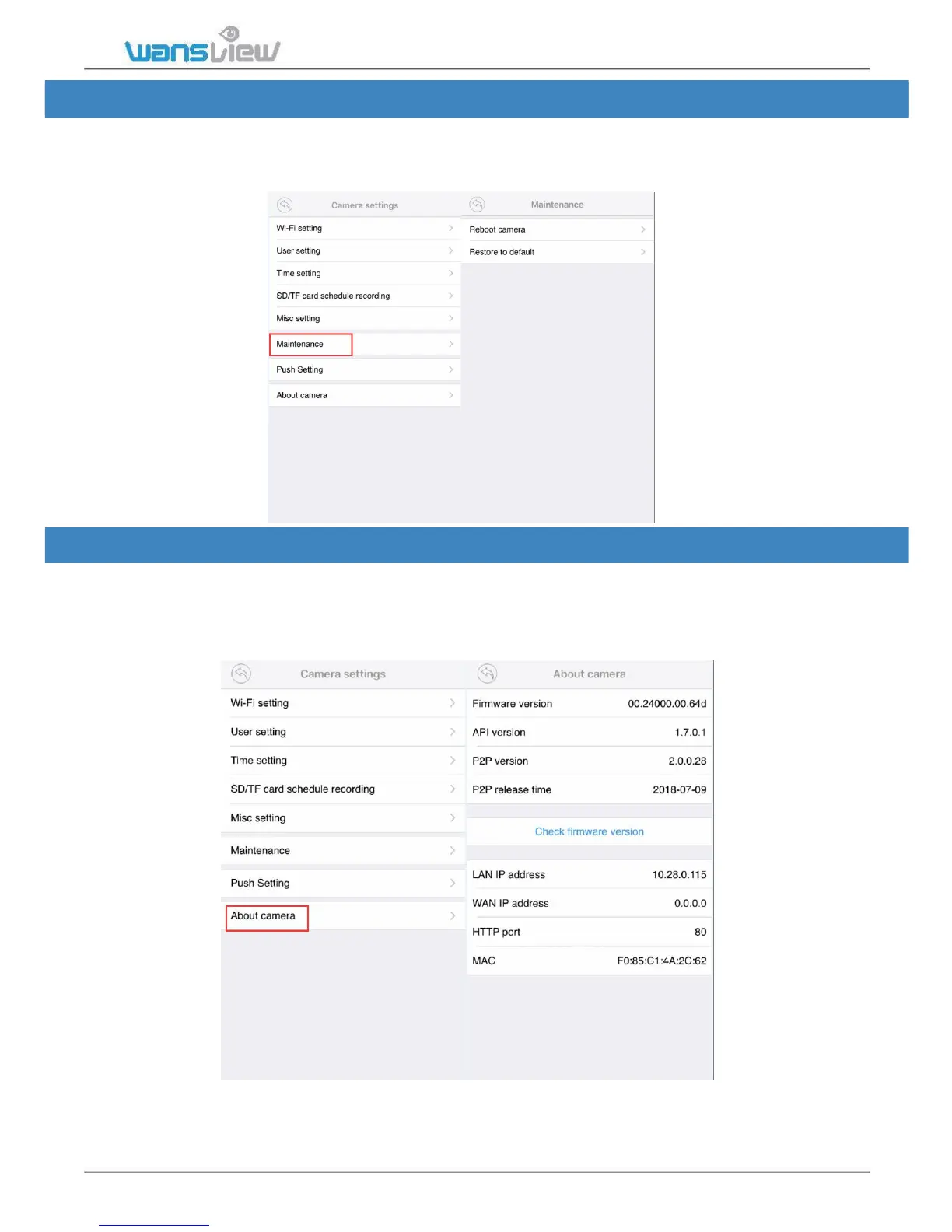 Here user can check the camera information, such as Firmware, P2P version, IP