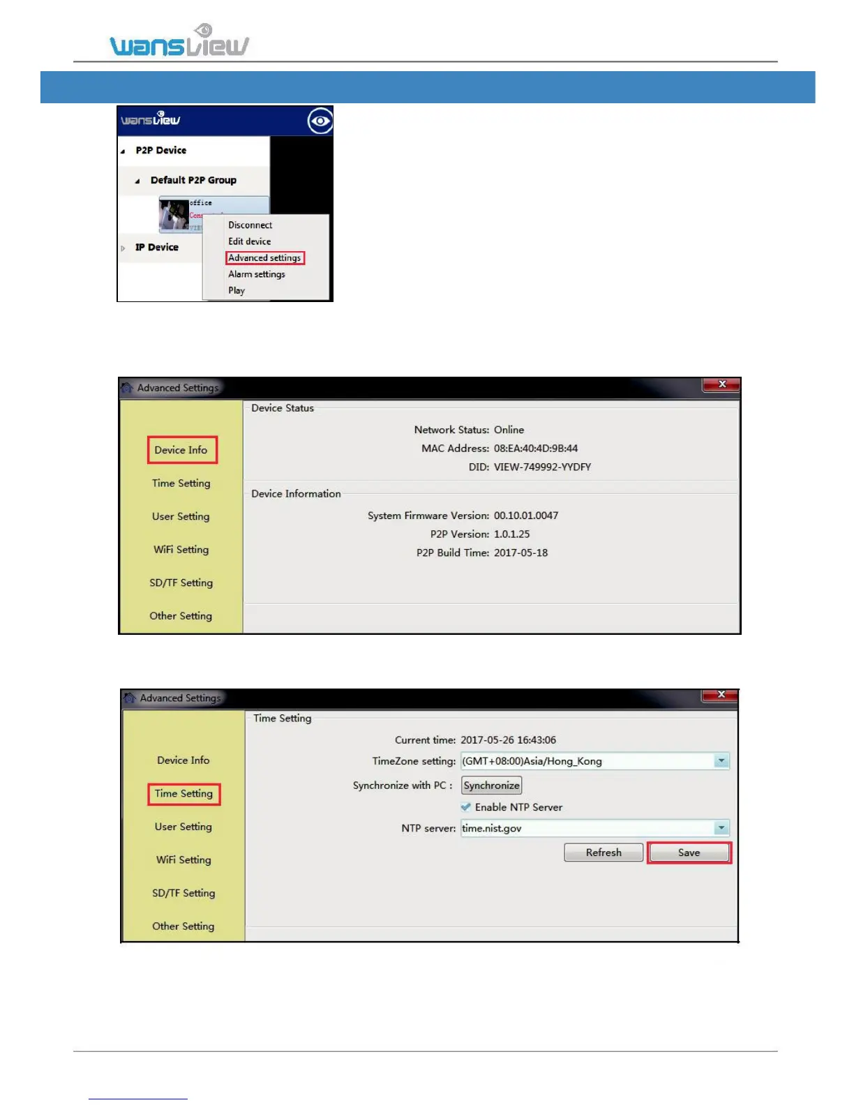 User can select a specific time zone, or sync the time to PC or to a NTP Server