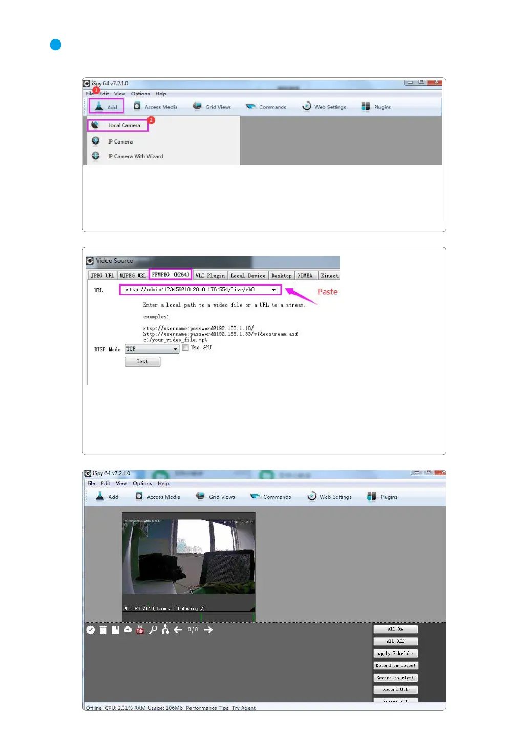 Launch iSpy software--Add Local Camera--Choose FFMPEG(H264) in Video