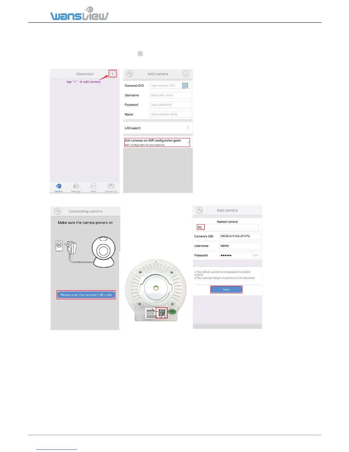 • Scan the QR code on the back of the camera, and name the camera. Then “Next”