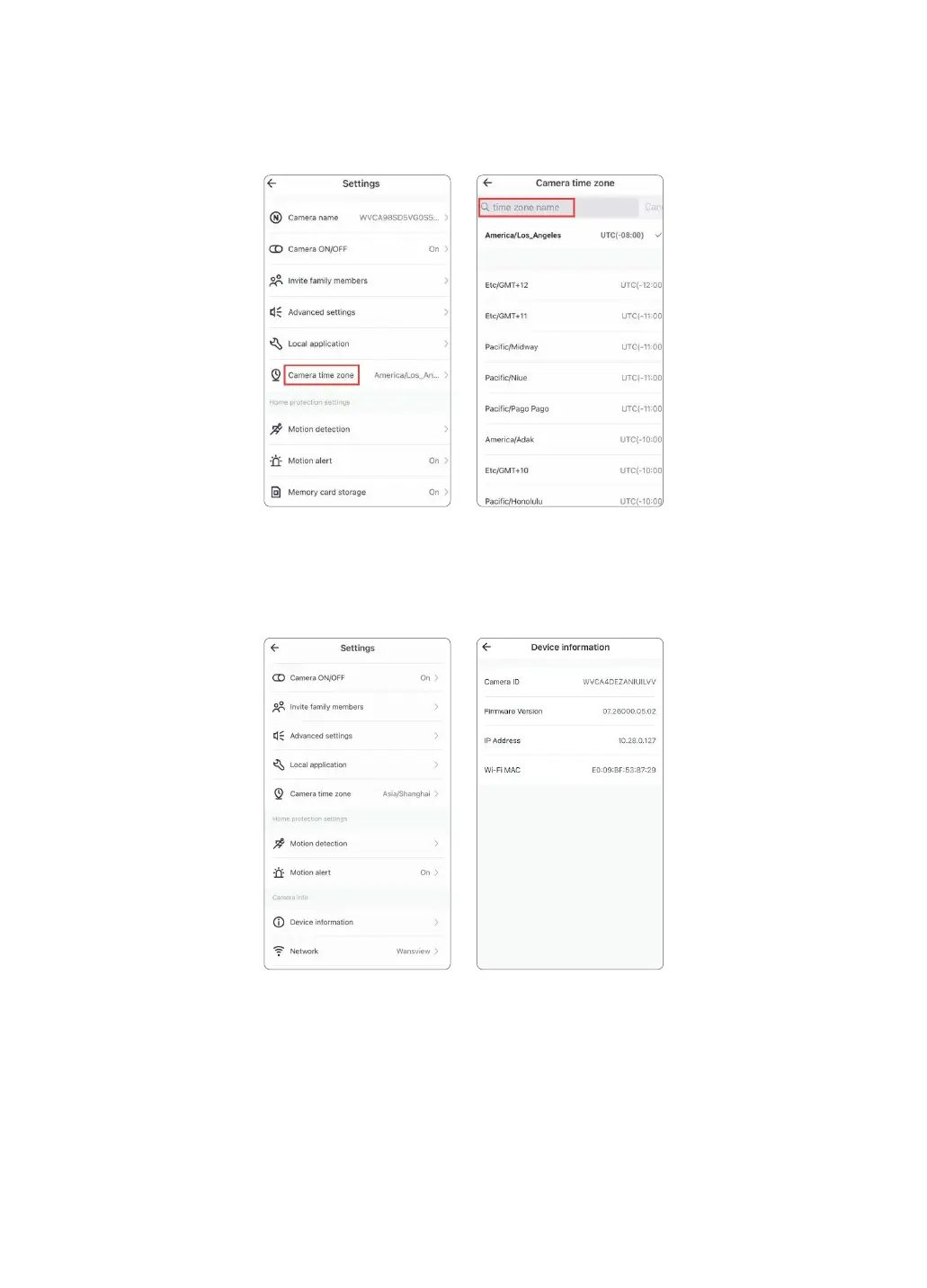 User can check the camera ID, firmware version,IP Address and WIFI Mac information.
