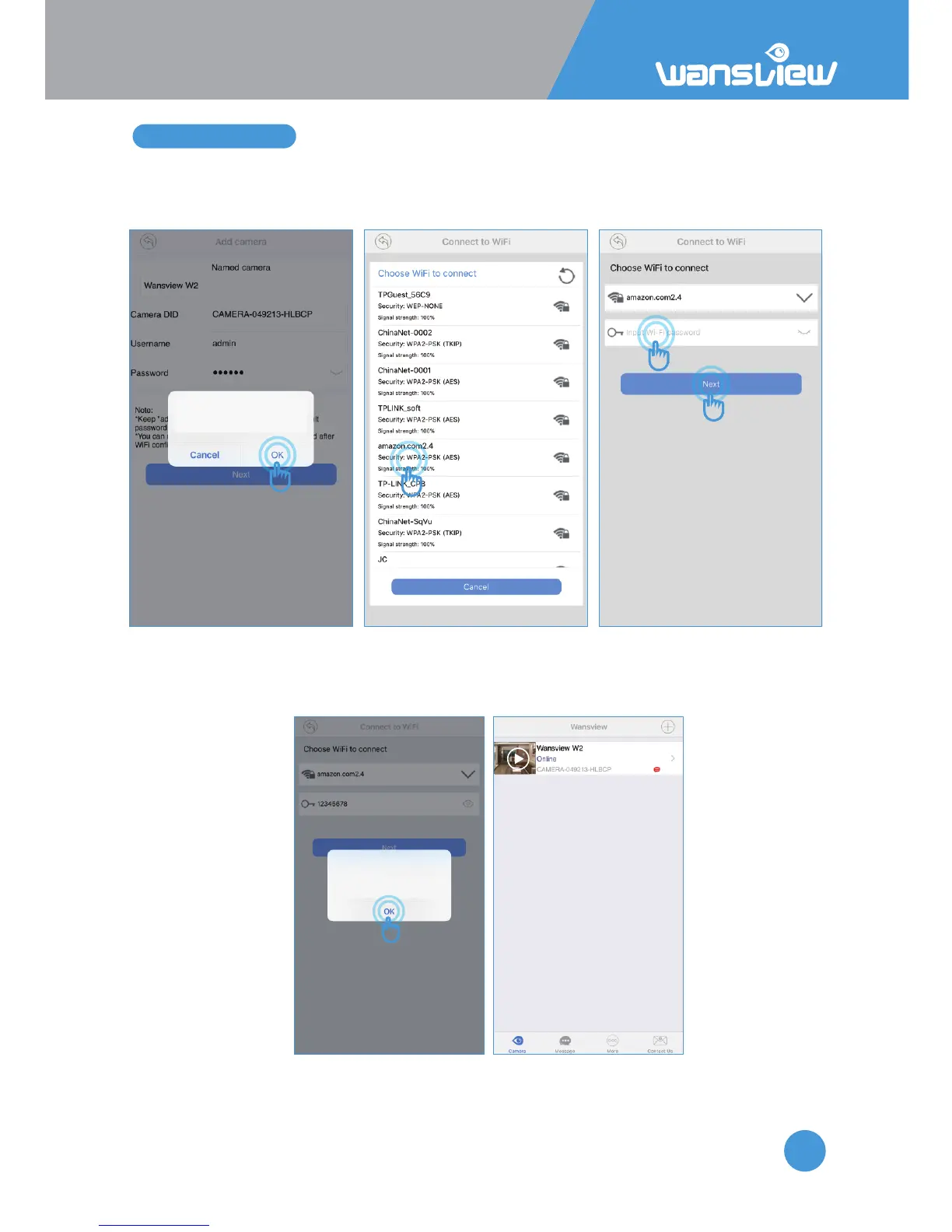 “Set WiFi success” will appear, then tap “OK”, camera will be “online”, and ethernet cable can be