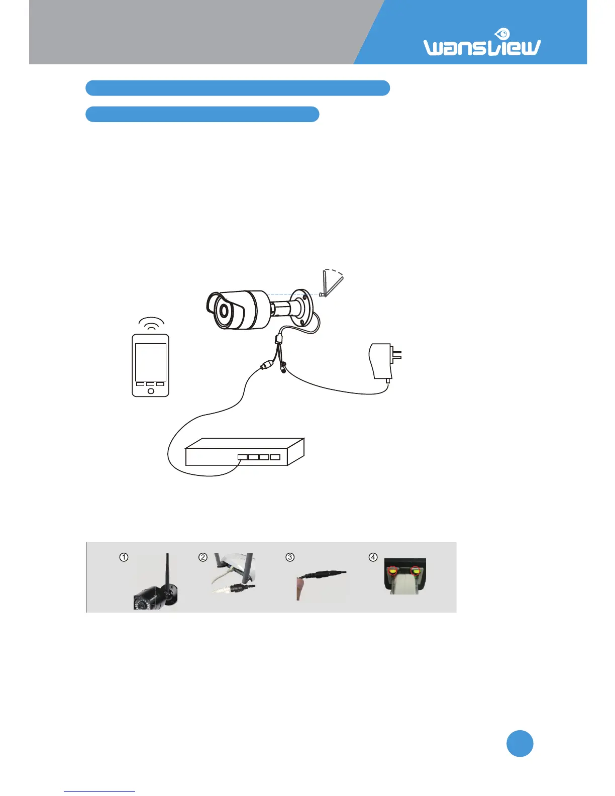 Go to the App Store and install the “Wansview” app. Install the antenna and connect the camera to