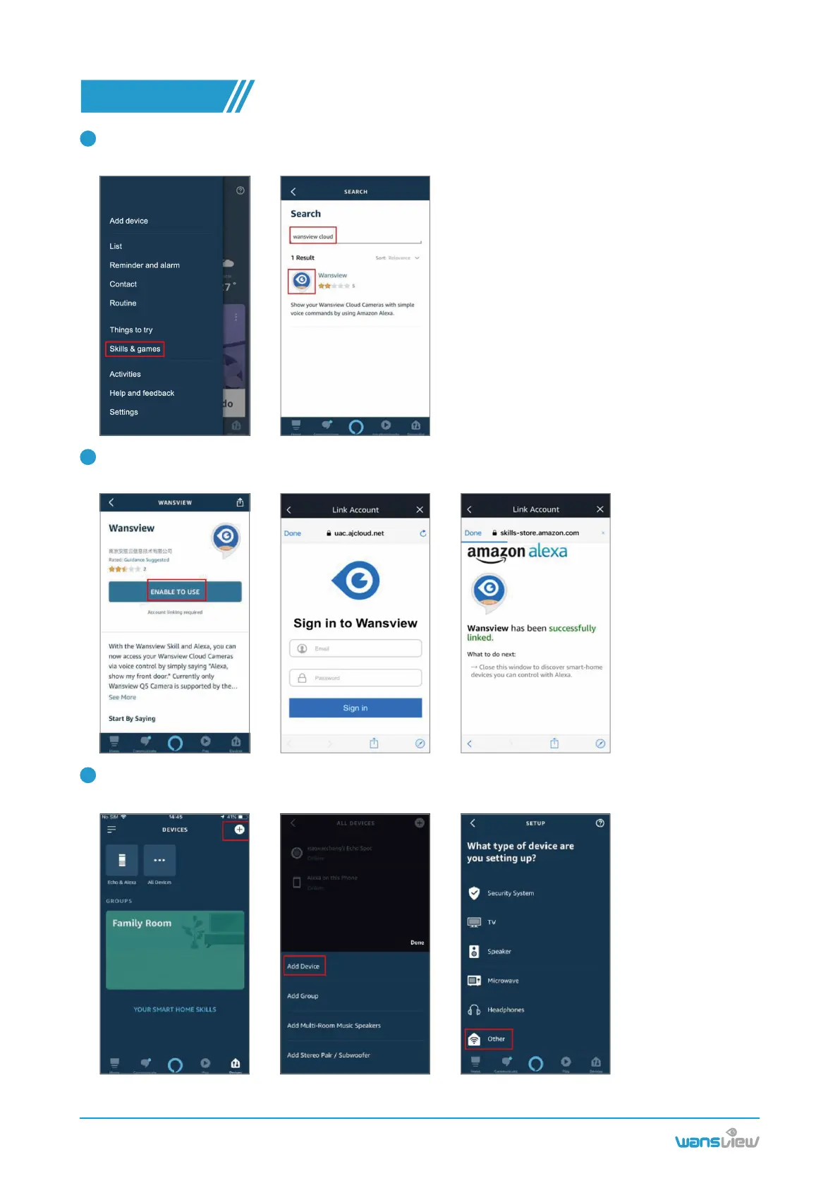 Enable the Wansview Cloud feature and log in your Wansview Cloud account. Allow the Alexa Device