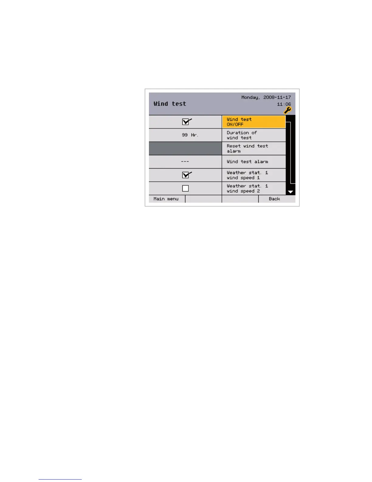 In this menu, a wind test can be set to monitor the sensors and an alarm, if