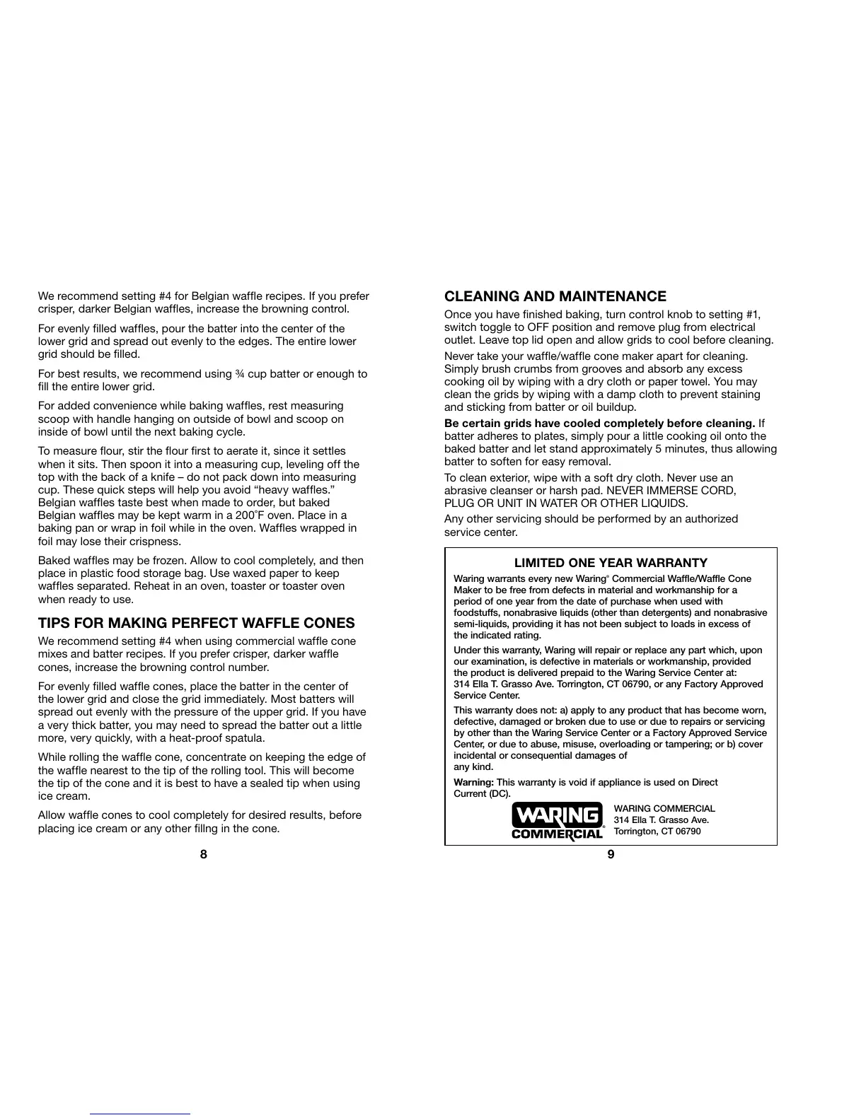 Under this warranty, Waring will repair or replace any part which, upon