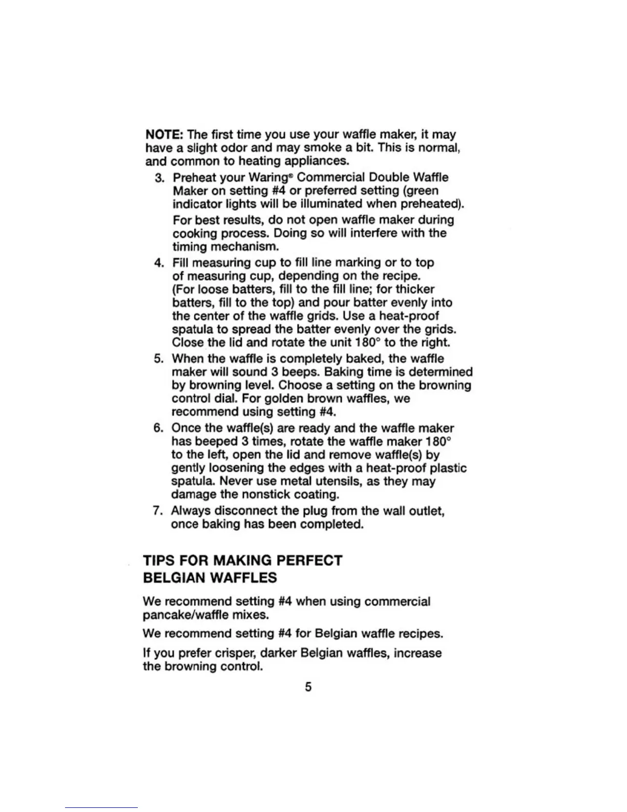 Waring WW250 - Baking Process; Tips for Making Perfect Belgian Waffles; Browning Control Recommendations