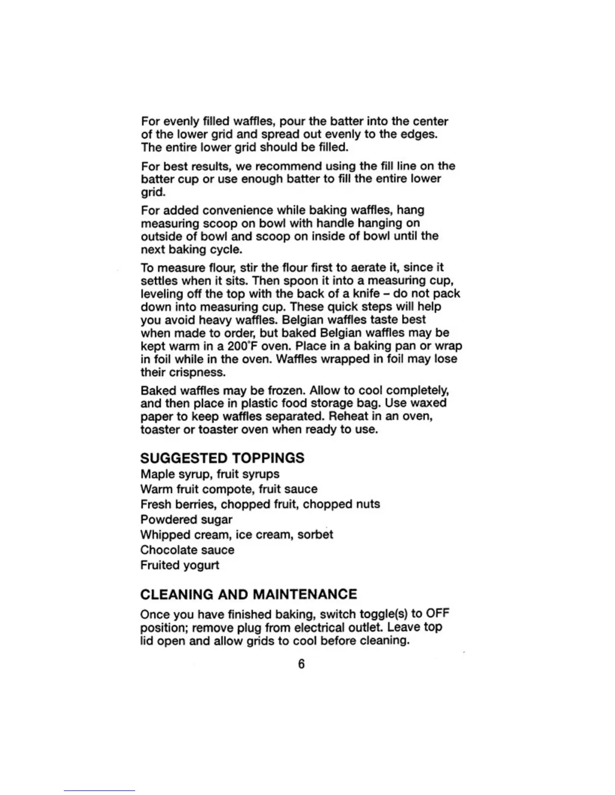 Waring WW250 - Batter Measurement and Handling; Suggested Toppings; Topping Options; Cleaning and Maintenance