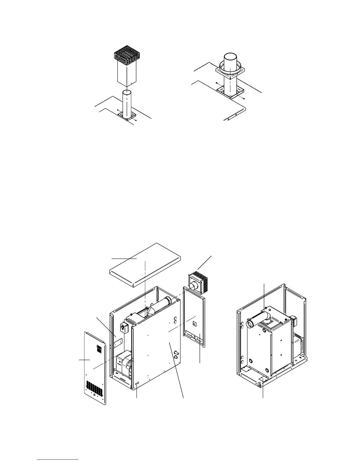 1. Remove the 2 screws connecting the flue main body to the Kabin Pak and lift off. It