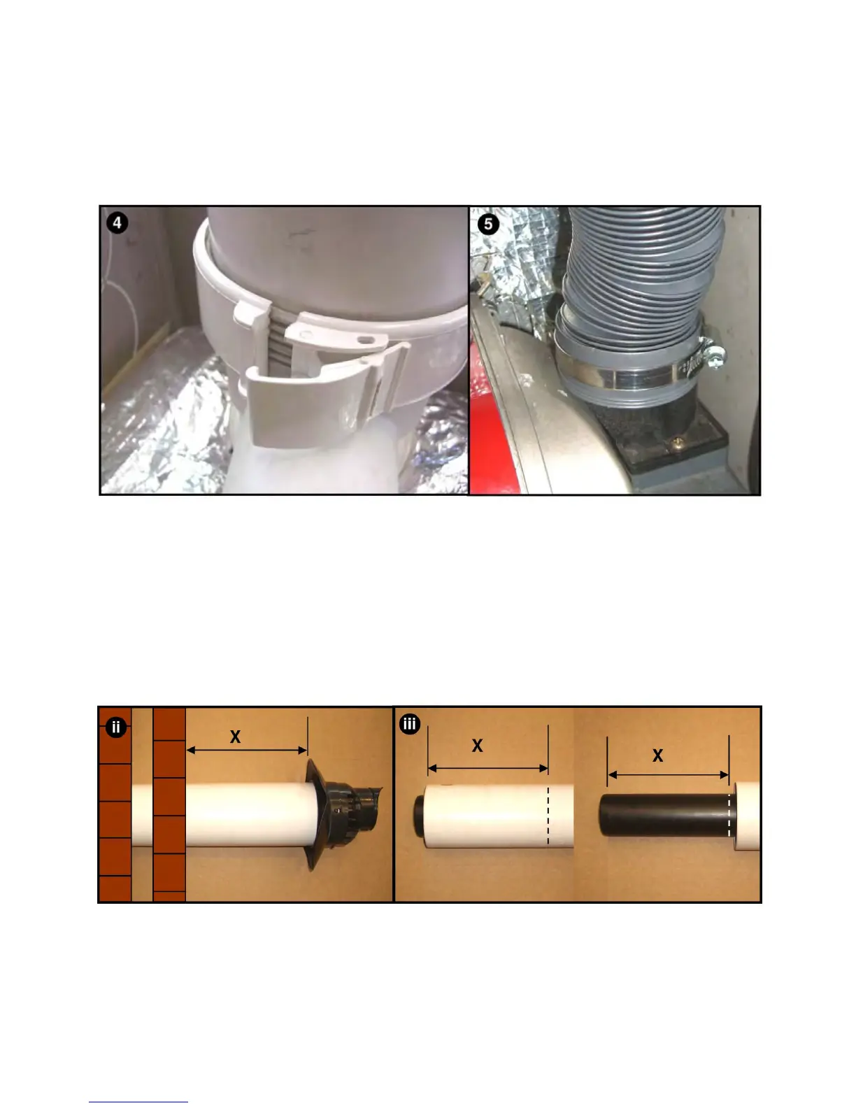 ii. Fit the flue terminal (E) and measure the excess length, X.