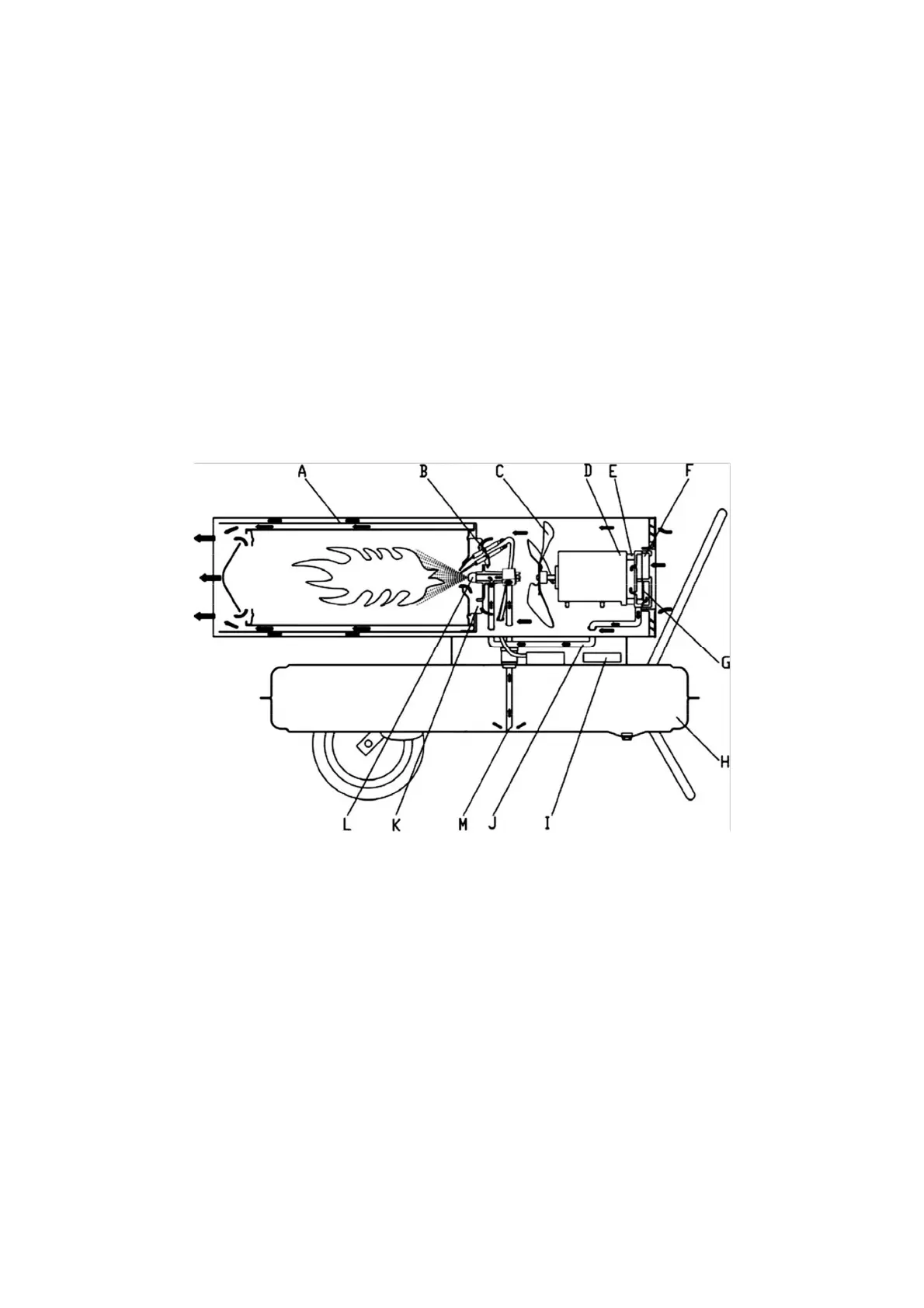 K. Plaque fixe de flamme L. Buse d'huile M. Tuyau d'aspiration d'huile