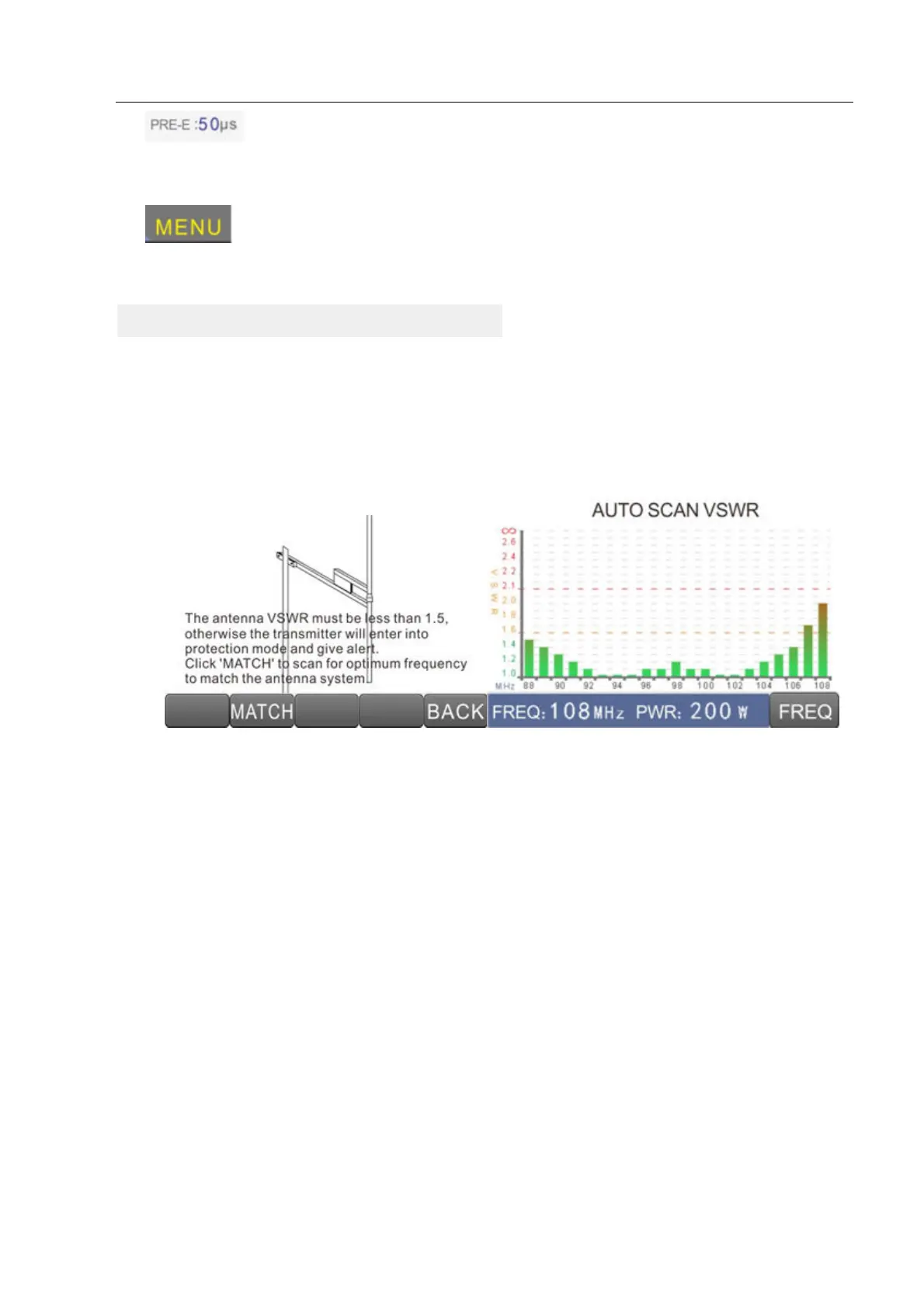 Automatic frequency sweep the antenna standing wave ratio from 88-108 MHZ for step 1