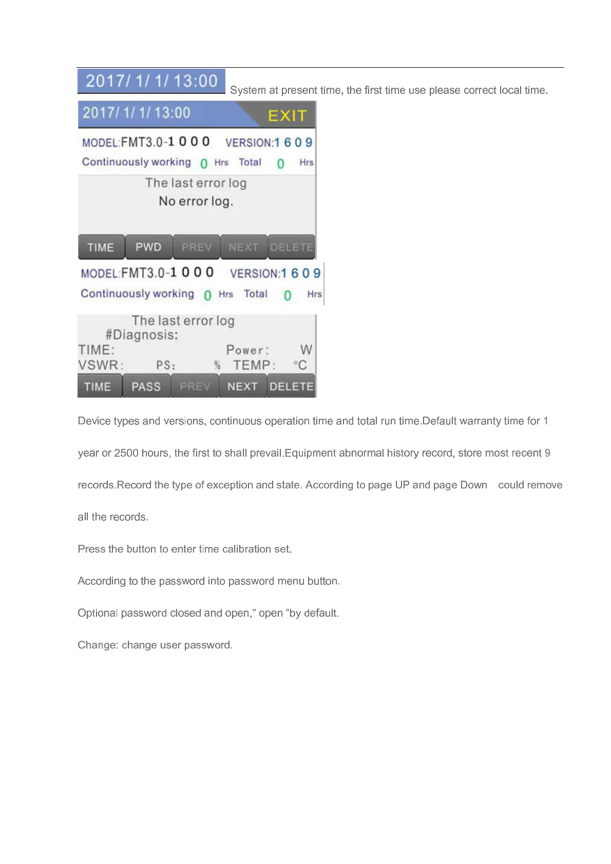 year or 2500 hours, the first to shall prevail.Equipment abnormal history record, store most recent 9