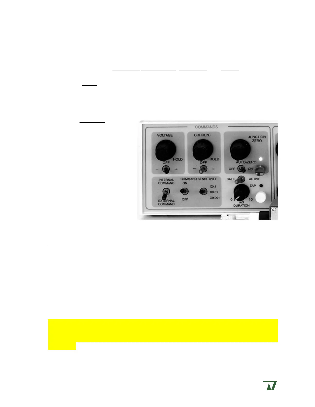 modes. Placing the instrument in current or voltage clamp mode activates either the VOLTAGE