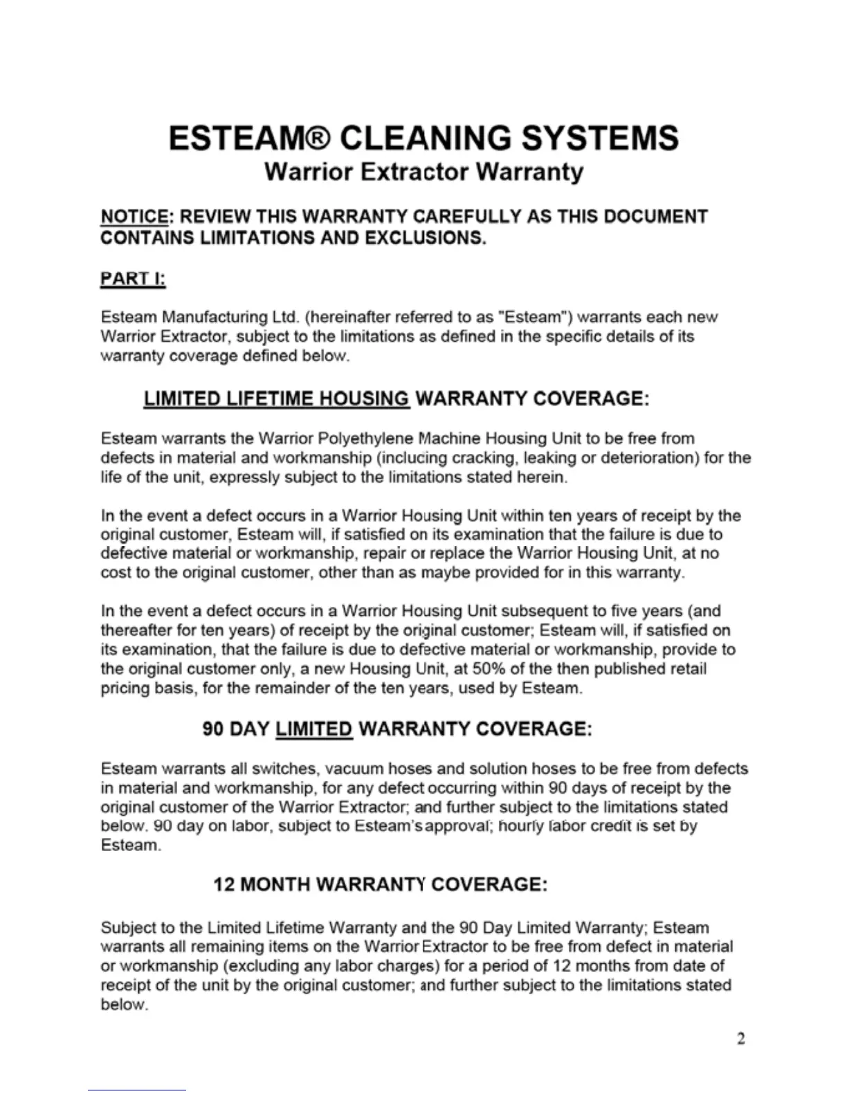 WARRIOR 150 - Warranty Information; Warrior Extractor Warranty Coverage