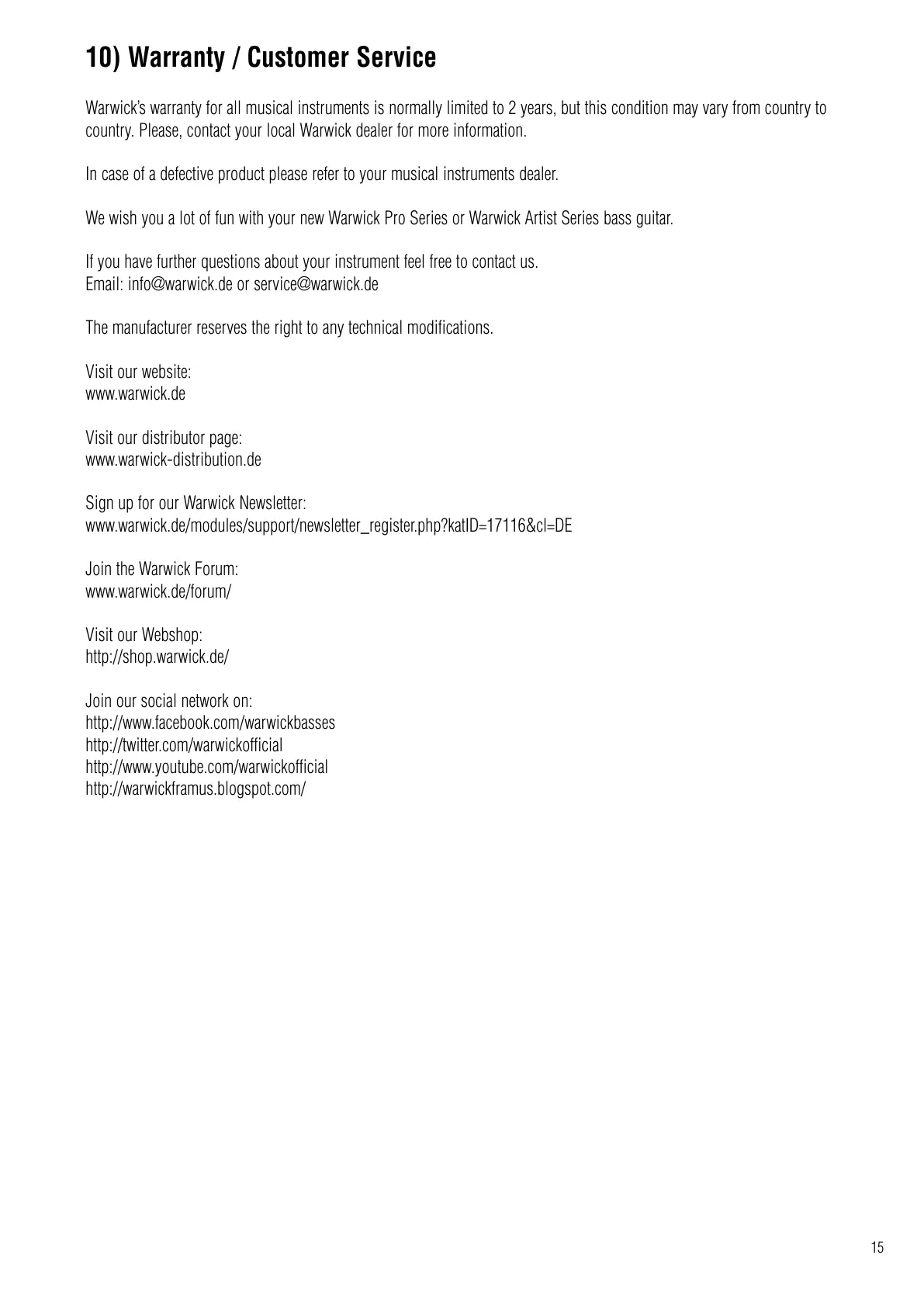 Warwick’s warranty for all musical instruments is normally limited to 2 years, but this condition may vary from country to