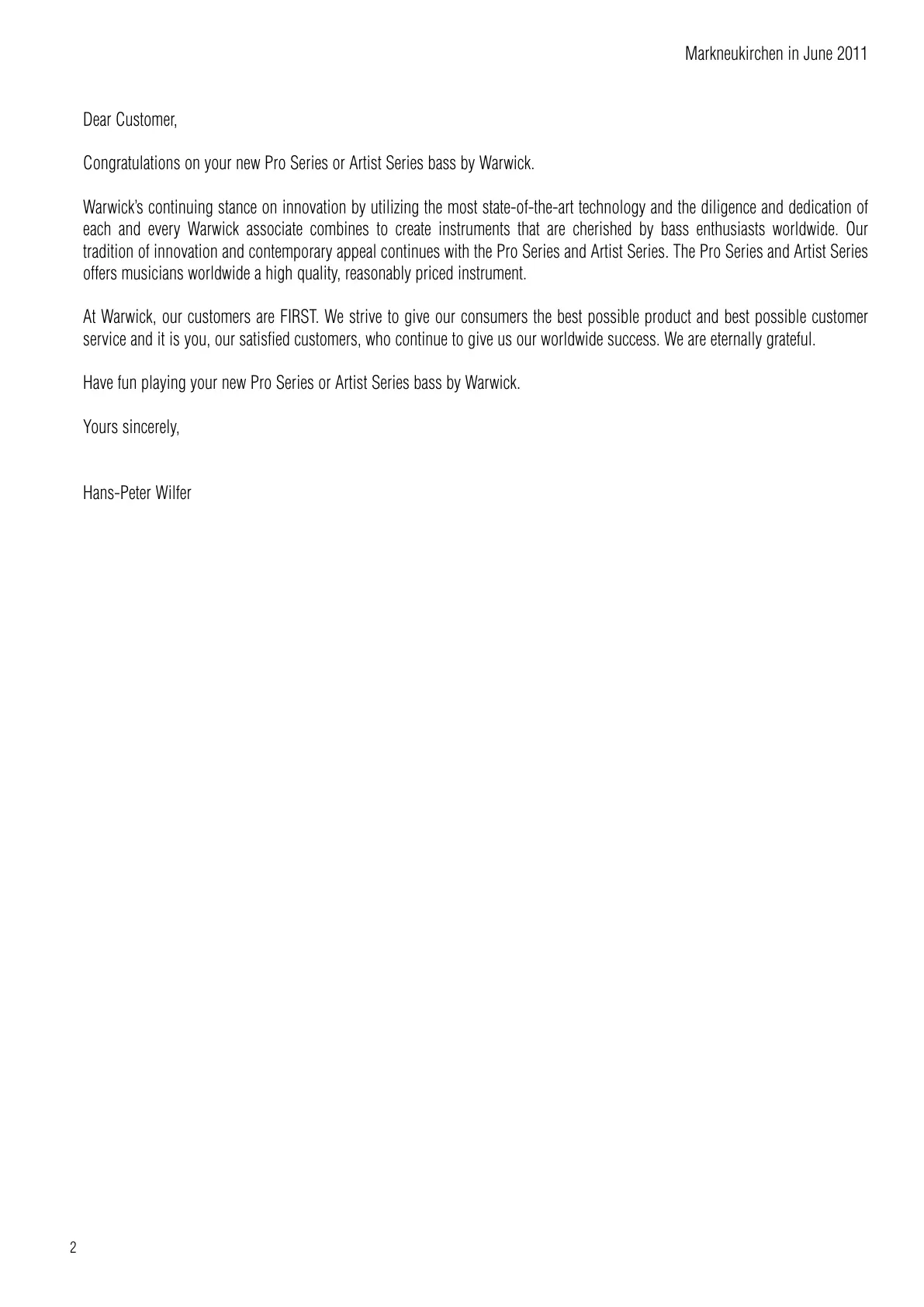 At Warwick, our customers are FIRST. We strive to give our consumers the best possible product and best possible customer