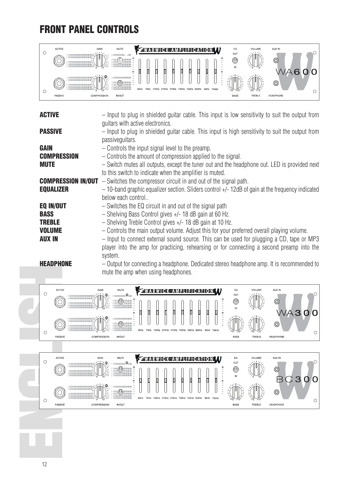 EQUALIZER – 10-band graphic equalizer section. Sliders control +/- 12dB of gain at the frequency indicated