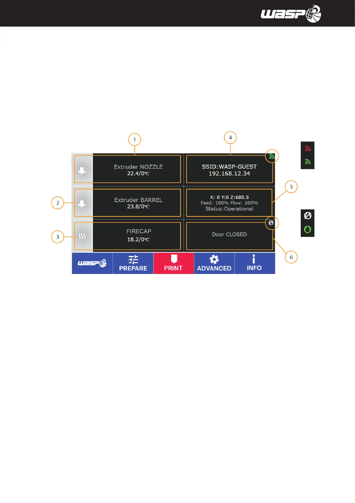 5. State of the machine: OPERATIONAL/PRINTING/PAUSE/CANCELLING, Autocalibration ENABLED/DISABLED
