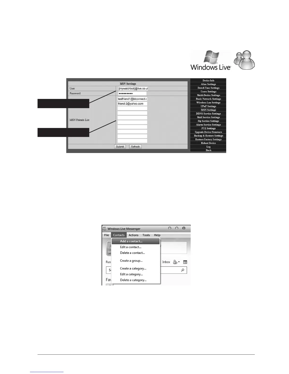 In the elds below, add the MSN details of those accounts you want to appear in the camera’s